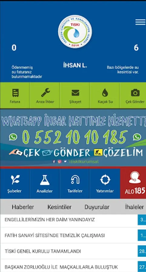 Trabzon Drinking Water and Sewerage (TİSKİ) General Directorate of mobile application with the bills you can pay, you can be aware of water cuts. You can also report a failure and check the status of your application. You may also be aware of the latest developments on dam level, water quality, water analysis and TİSKİ.