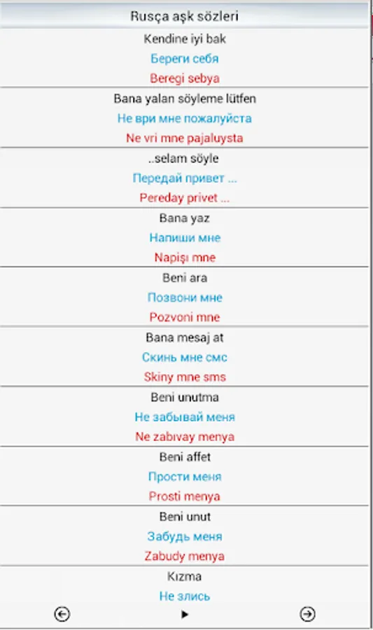 Türk kültüründe de dilinde de aşkın etkisi büyüktür. Türk kültüründe aşka olan ilginin artması İslam'ın kabul edilmesi ile başladı.Rusça aşk sözleri sizleri sevdikleriniz ile ortak noktada buluşturan etkili cümlelerden oluşmaktadır. Sevdiğinize söylemek ya da bir sms ile iletmek isteyeceğiniz en güzel, en etkileyici aşk sözleri, sevgiliye aşk sözleri, aşkı anlatan sözler, aşkla ilgili güzel sözler sizler için bu uygulamayı hazırladık. Bu uygulamadan Rusçayı belli bir düzeyde bilenler de ilk defa başlayanlar da yararlanabilecektir.