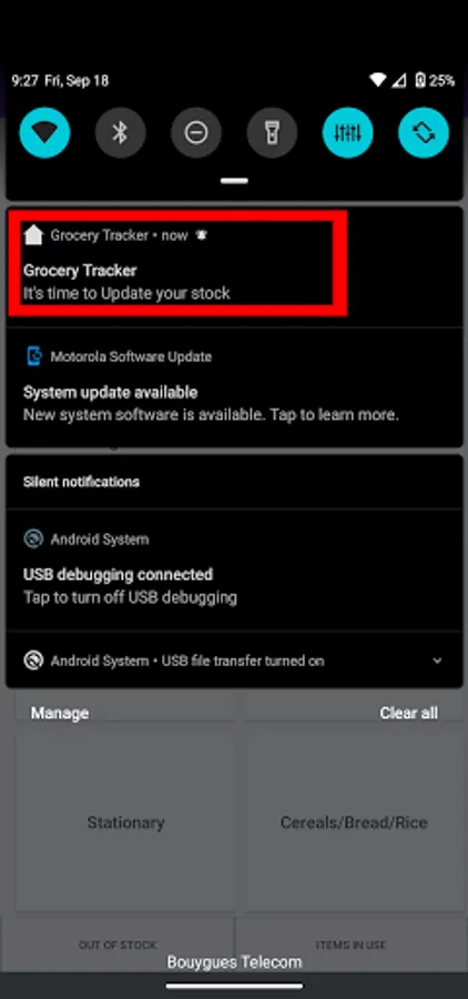 "Track My Grocery Items" allows user to update the stock quantity for every product listed.There is a predefined list which can be modified by adding new or removing from the list.we can also share the consolidated list of out of stock items with others.App has the benefit of sending notification to the user to update the stock.