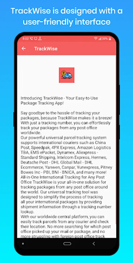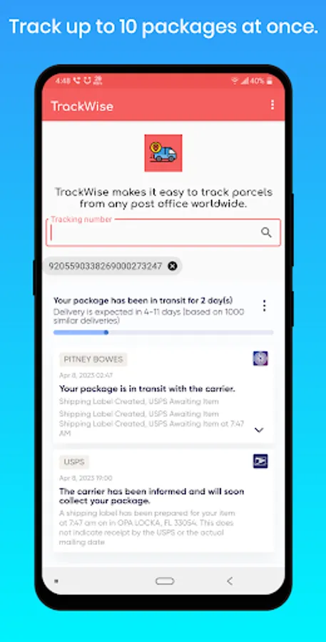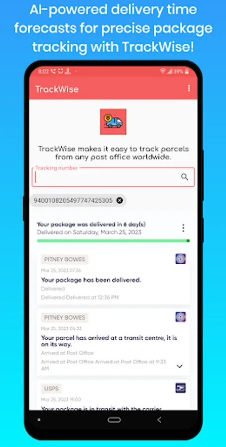 Whether you're a frequent online shopper, a business owner managing shipments, or just someone who wants to keep tabs on their packages, TrackWise is the go-to app for all your package tracking needs. Download TrackWise now and experience the convenience and efficiency of tracking your packages like never before!