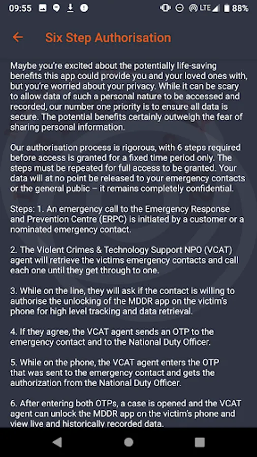 Our authorisation process is rigorous, with 6 steps required before access is granted for a fixed time period only. These steps must be repeated for full access to be granted. Your data will at no point be released to your emergency contacts or the general public – it remains completely confidential. - see https://trackbox.world/mobile-device-data-recorder/