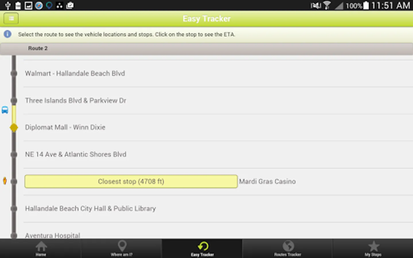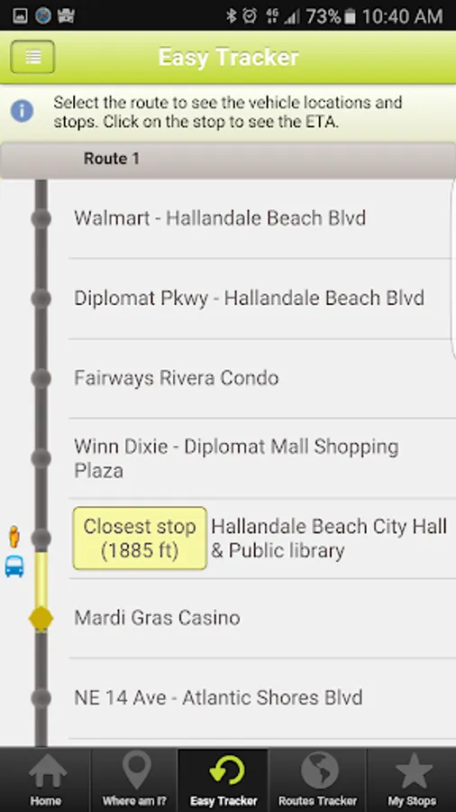 The City of Hallandale Beach Mobile App will help you track the City’s four (4) community bus routes. The application will allow tracking the location of the buses on the map and providing you with real time information on the arrival of the buses at a designated stop. You will be able to create a list of your favorite stops to quickly have access to the buses estimated time of arrival (ETA).