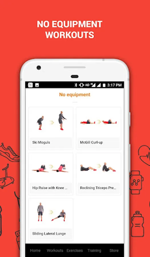 Push-ups, squats, sit-ups, plank, lunges, jumping jacks, crunches, triceps dips, and lots more.