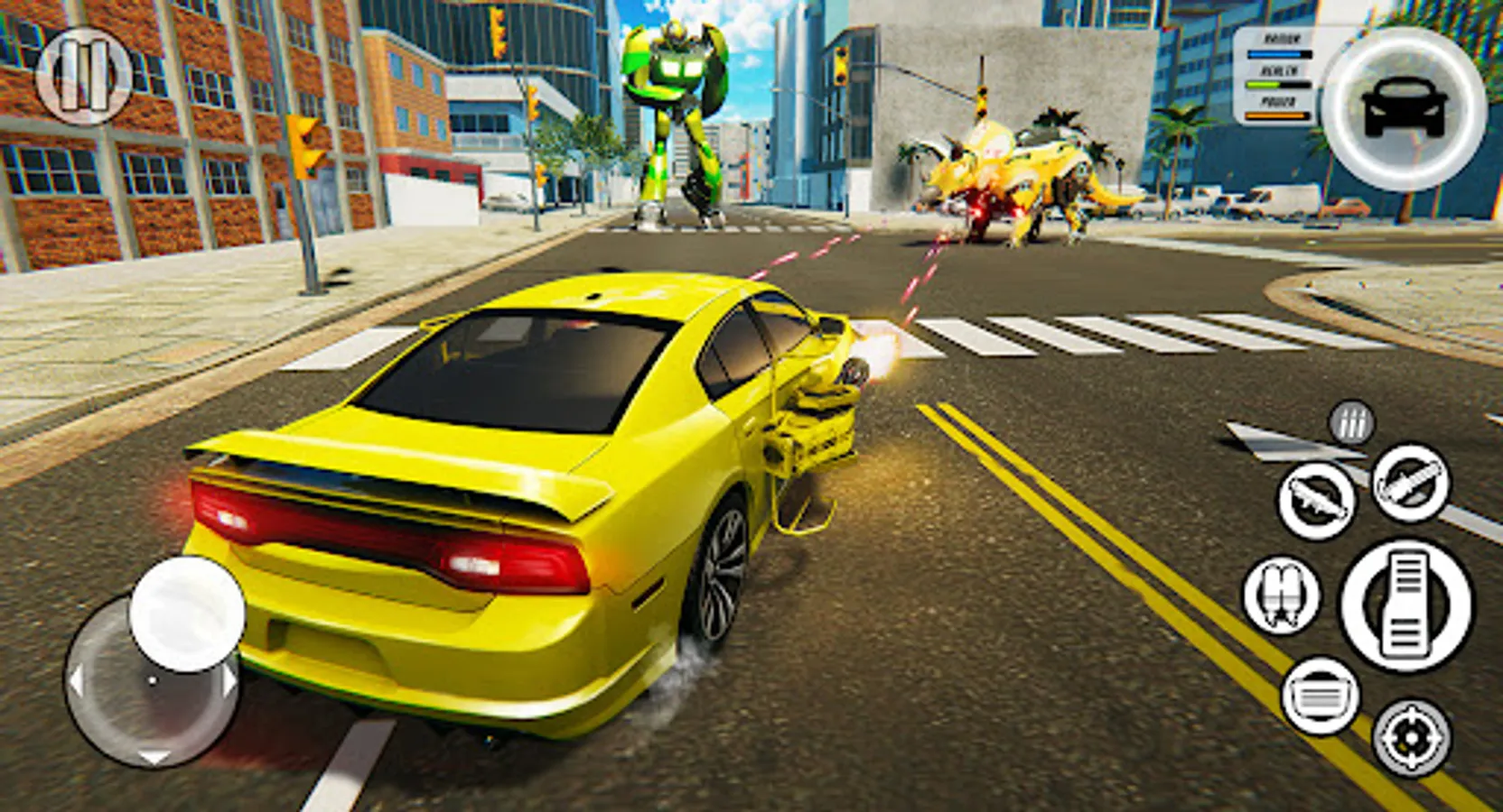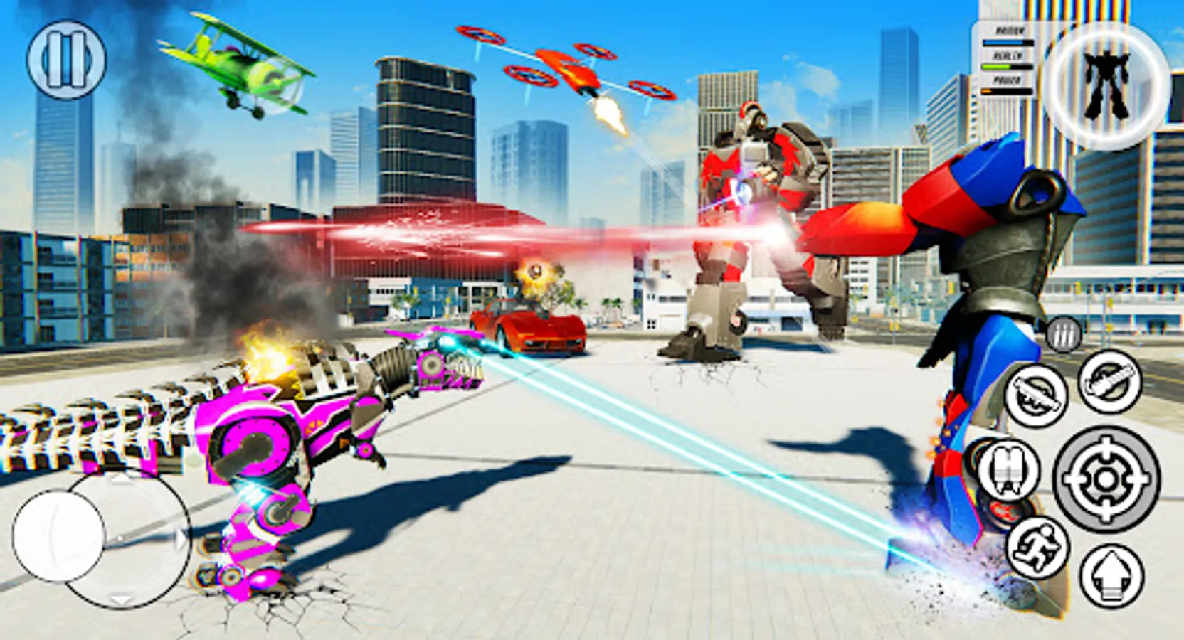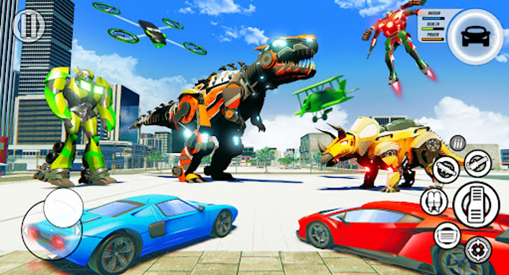 In our free robot car games, you can play in story mode, also you can explore an unlimited open robot world. In our transforming games, you can use power-ups to take control of the robots city. Become a flying helicopter robot boss and take control of town!