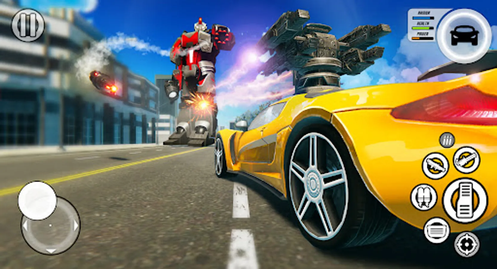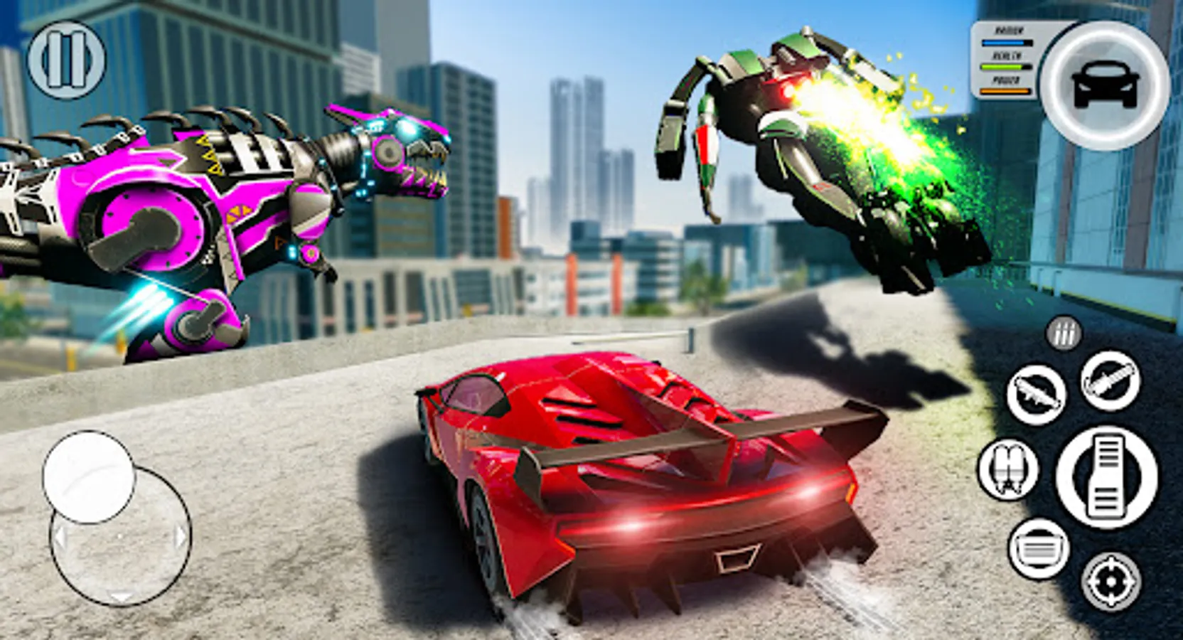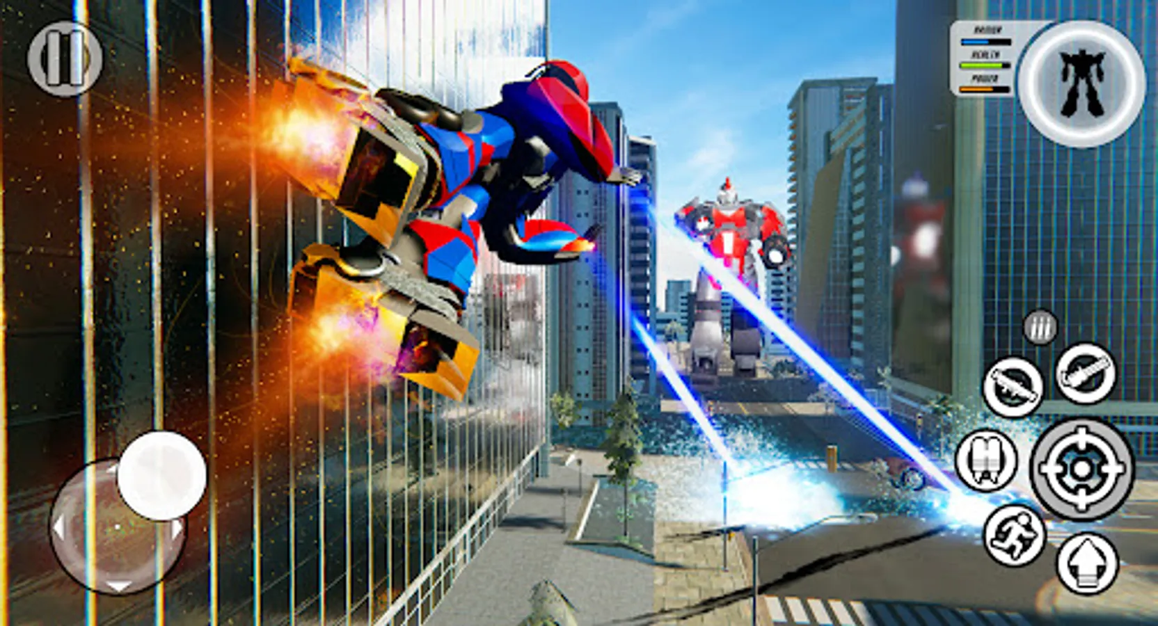 In our free robot car games, you can play in story mode, also you can explore an unlimited open robot world. In our transforming games, you can use power-ups to take control of the robots city. Become a flying helicopter robot boss and take control of town!