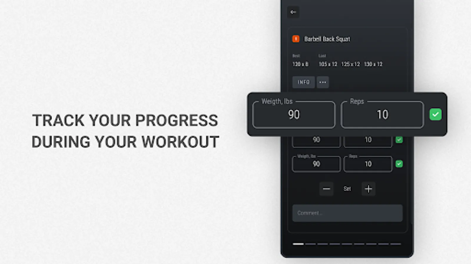 Mark the exercises you’re done with, add weight, reps and sets, total workout time and more during the workout.