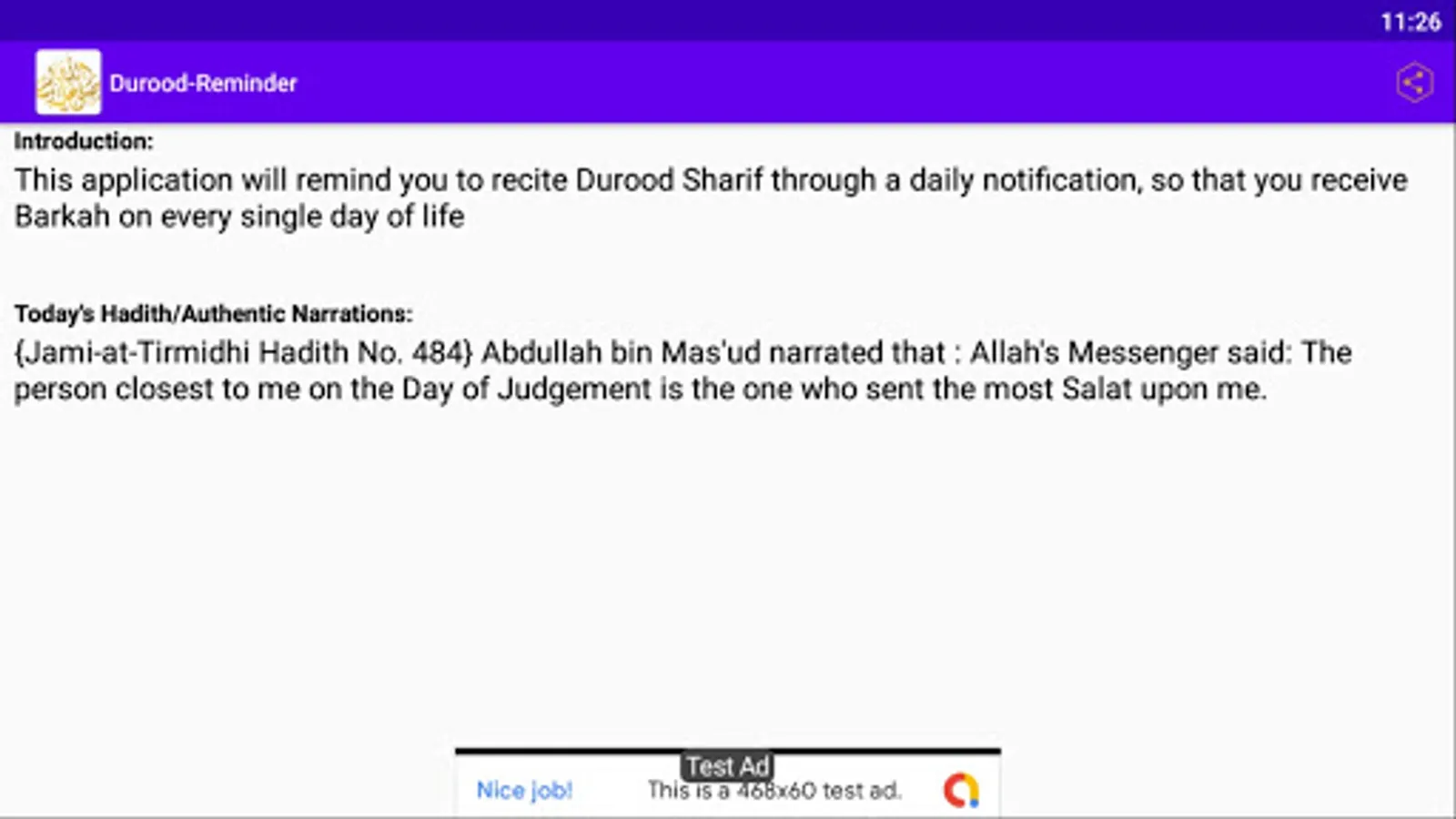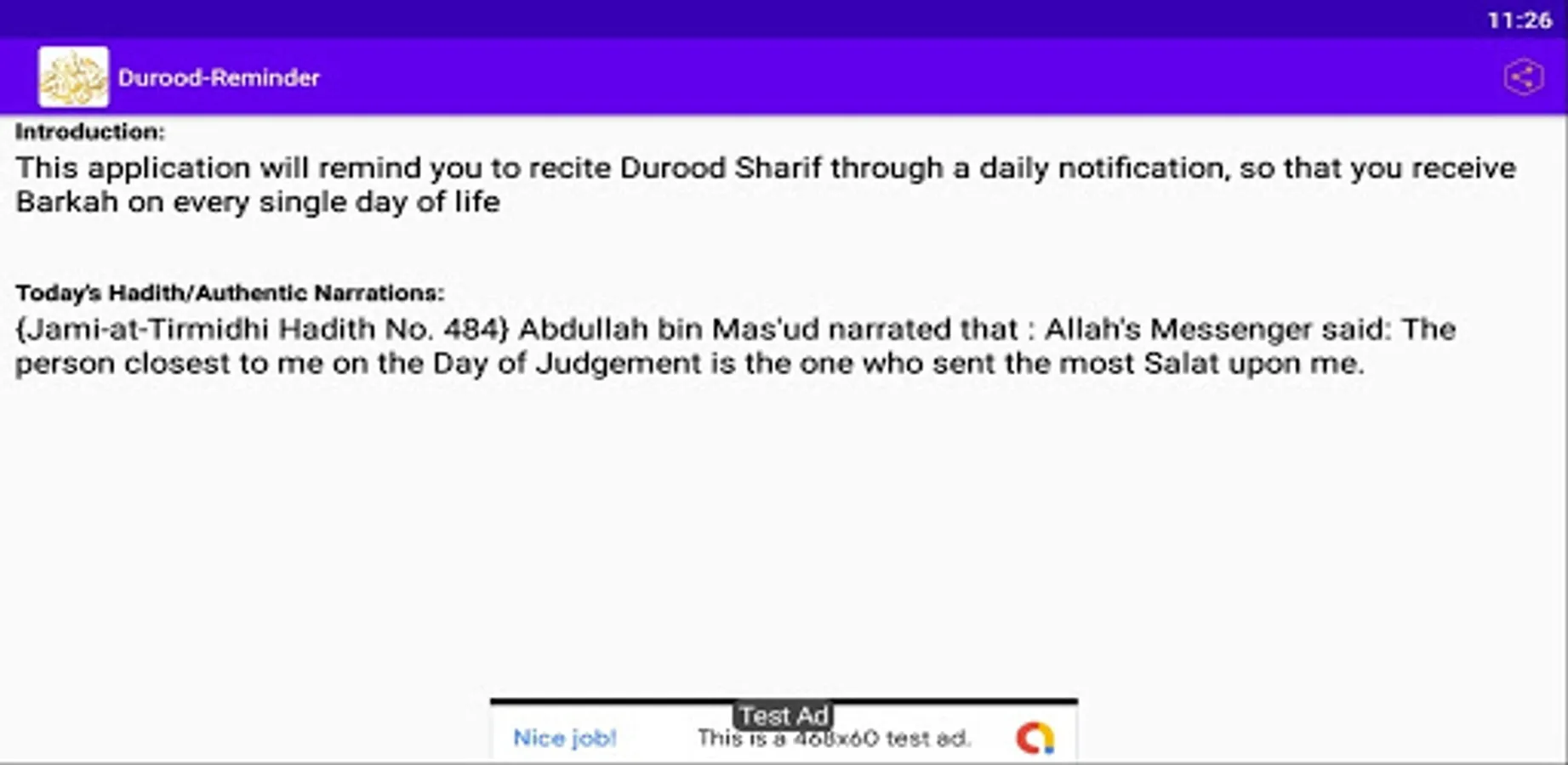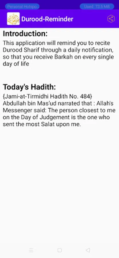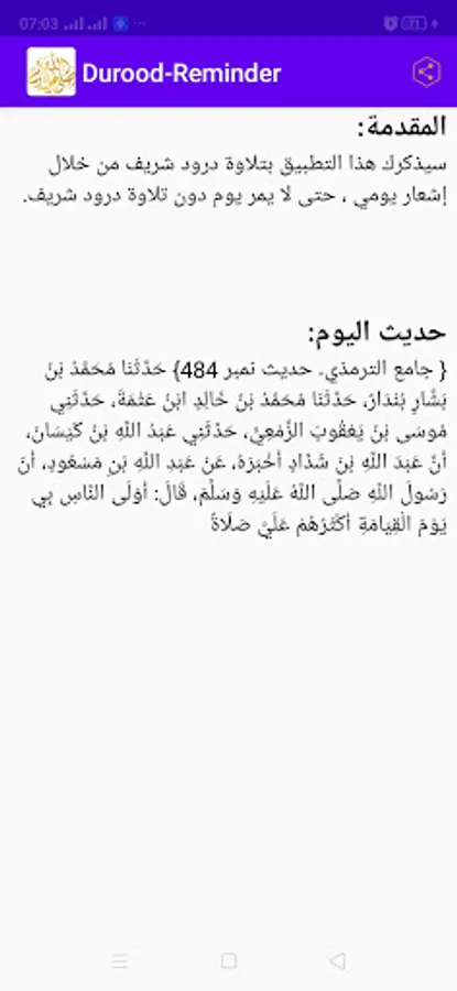 Durood Shareef is a sure means of Allah Ta'ala granting blessings, peace, prosperity and and favours. We believe that the day without reciting Durood Shareef is a useless day, that's why we have developed this beautiful application. It reminds us daily to recite Durood Shareef so that not a single day of us passes without blessings from Allah Ta'ala. In this application, hadith/authentic narrations are also shared on daily basis to keep us motivated and revive our faith.