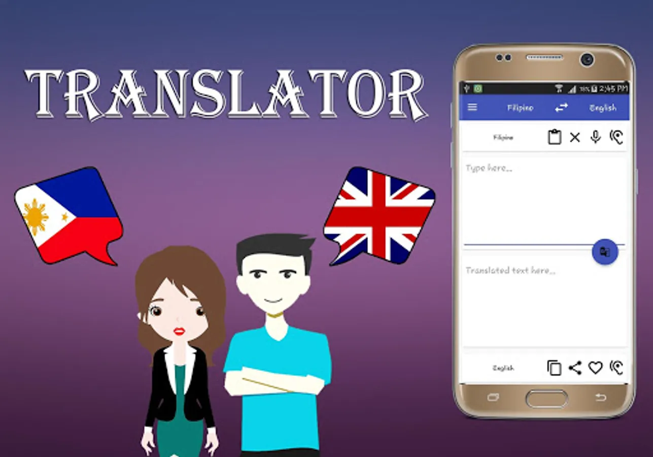 * Filipino To English Translator And English To Filipino Translation is the most powerful translation tool on your android. translate any sentence or phrase into any destination language, and enjoy a set of useful add-on features such as text-to-speech, and integrated social media support.