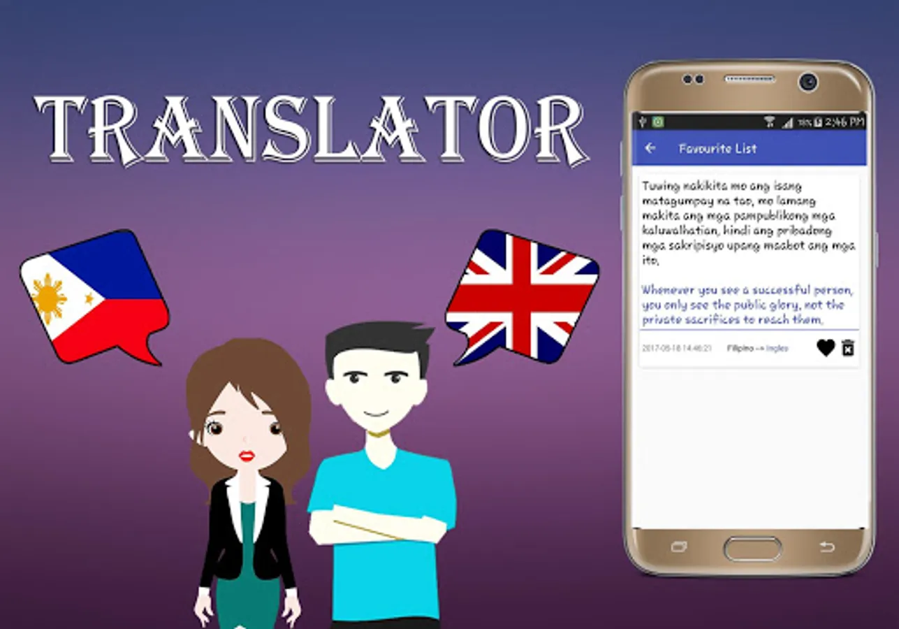 * Filipino To English Translator And English To Filipino Translation is a must have app for any traveler around the world. you will have access to the best languages packs and voice recognition in the world within your device that you can carry anywhere you go. this language app is designed for many purposes in mind including: everyday conversation, traffic signs, maps, local news, business languages, academic papers, and so on. with just a few taps on your device you will be able to understand most written and spoken words in the language you are not familiar with. it will greatly assist you in communicating with the locals.