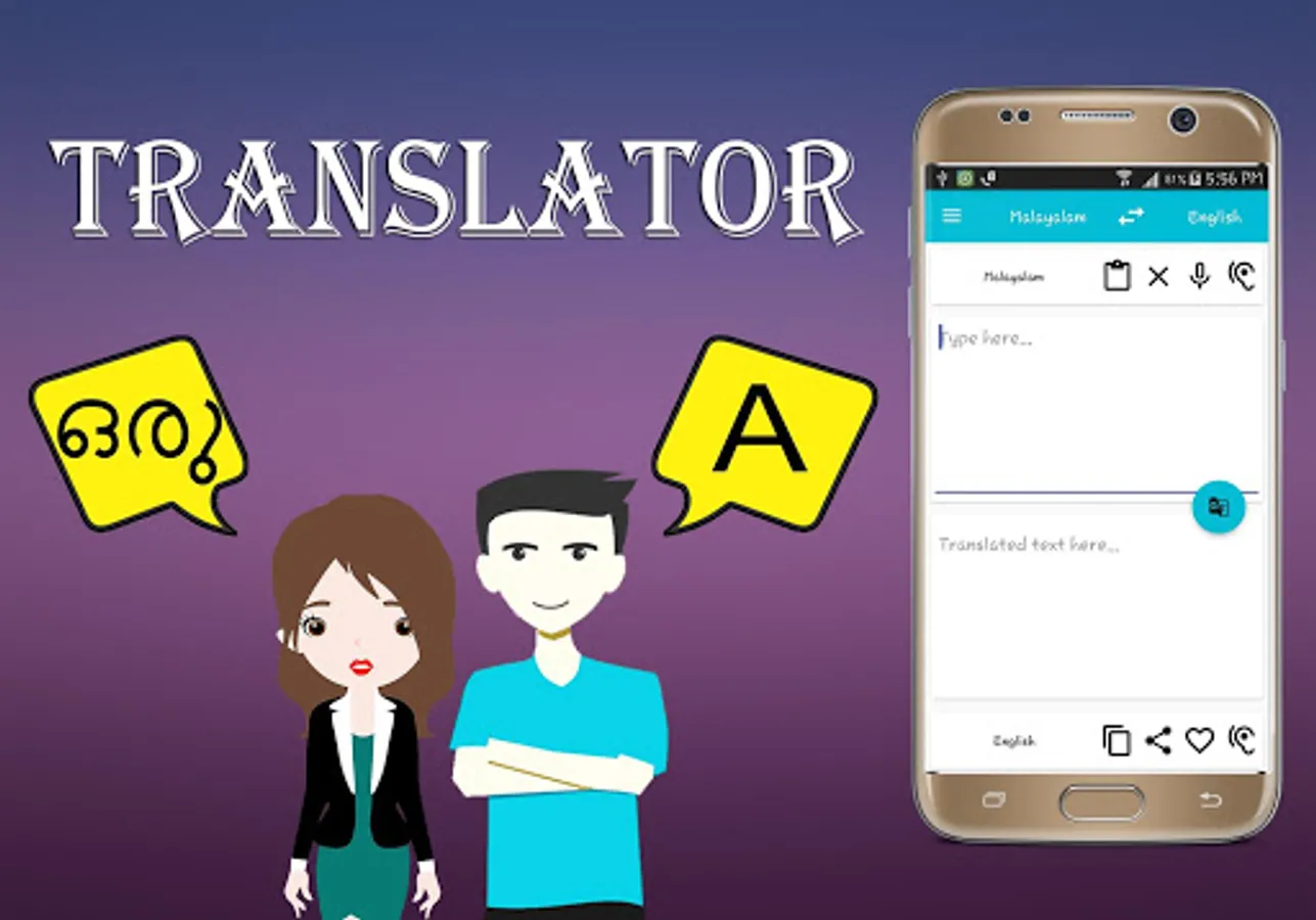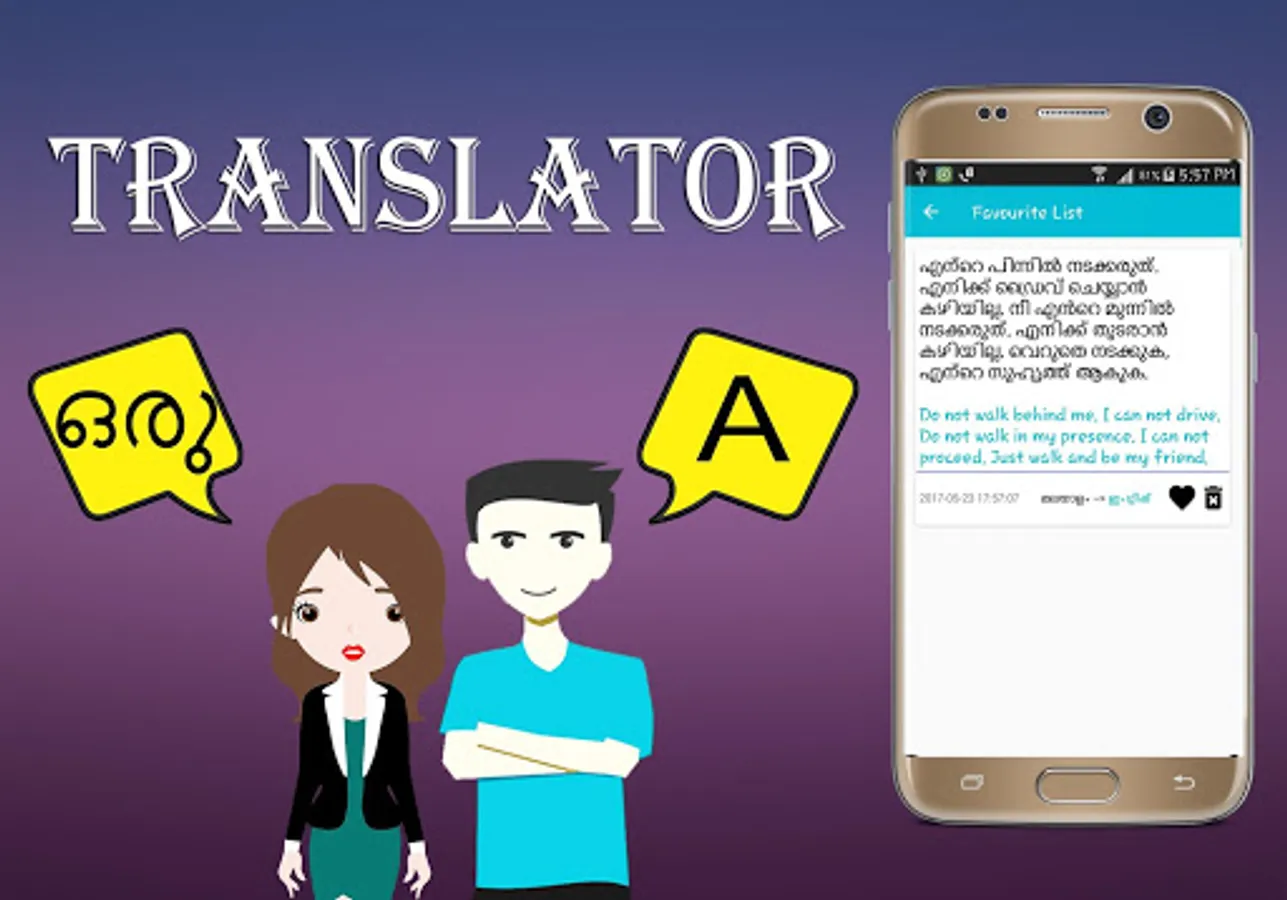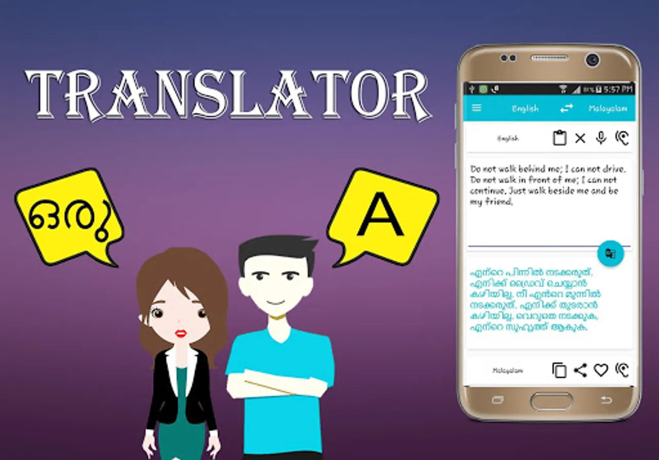* Malayalam To English Translator And English To Malayalam Translation is the most powerful translation tool on your android. translate any sentence or phrase into any destination language, and enjoy a set of useful add-on features such as text-to-speech, and integrated social media support.