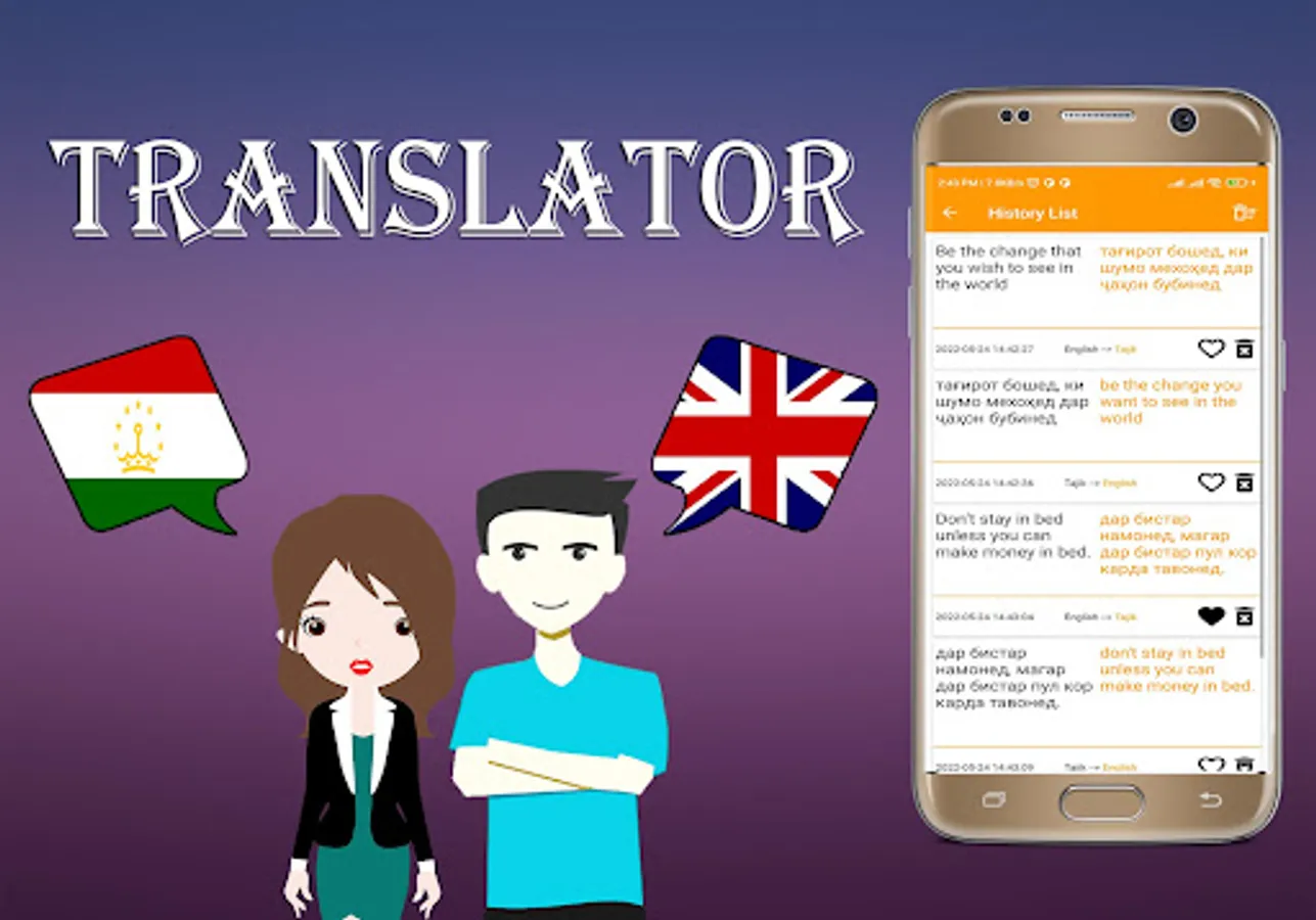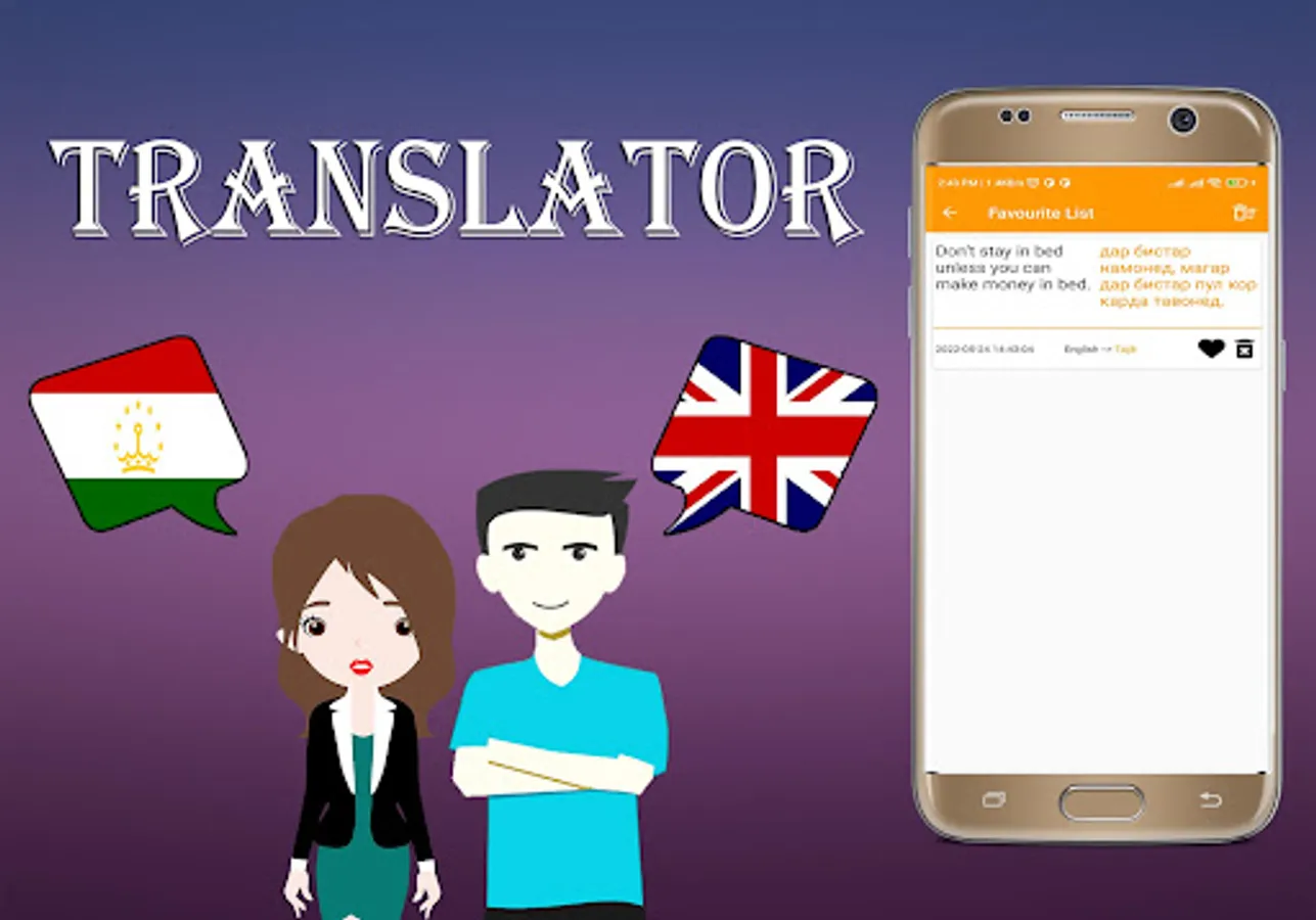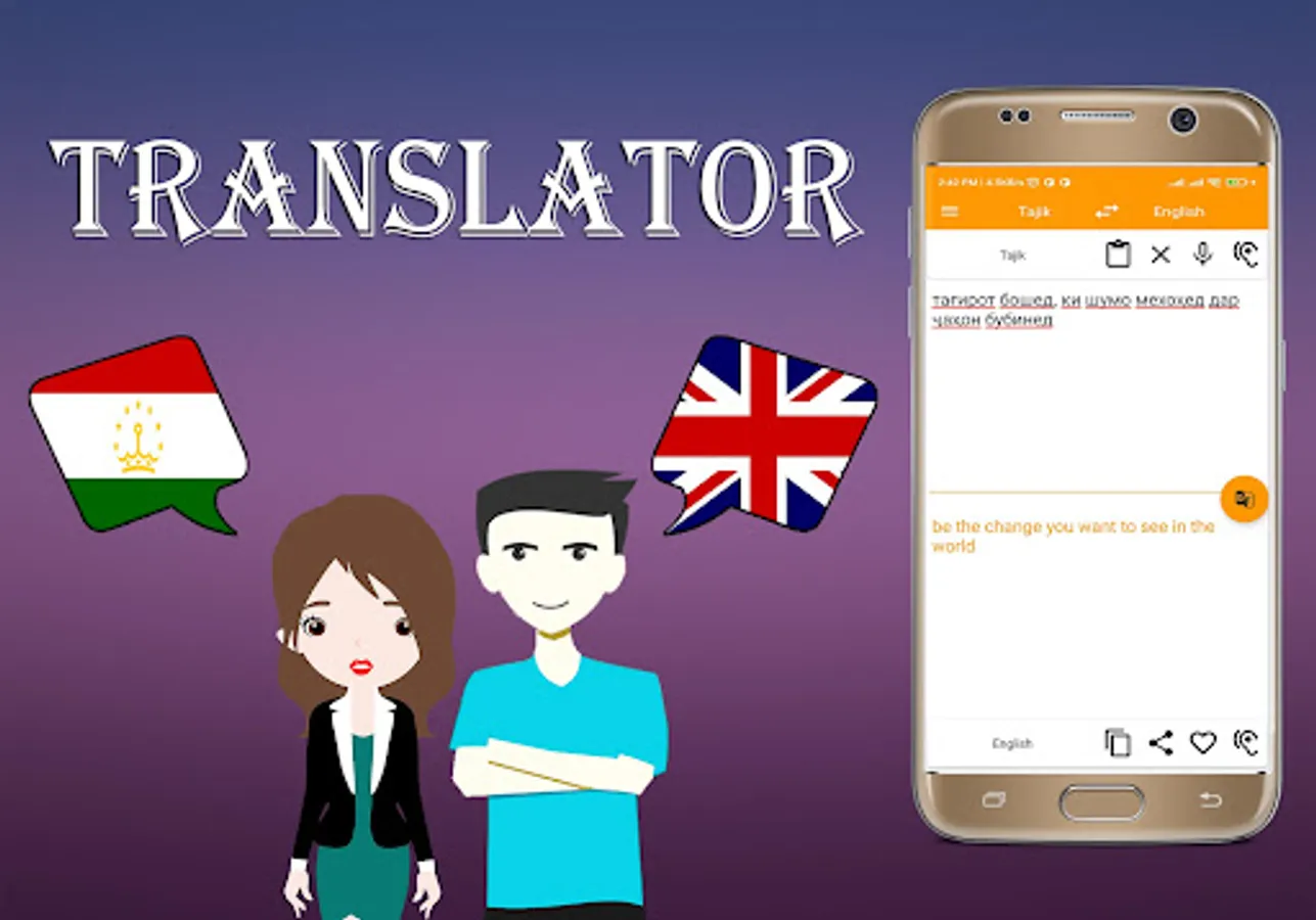 * Tajik To English Translator And English To Tajik Translation is the most powerful translation tool on your android. translate any sentence or phrase into any destination language, and enjoy a set of useful add-on features such as text-to-speech, and integrated social media support.