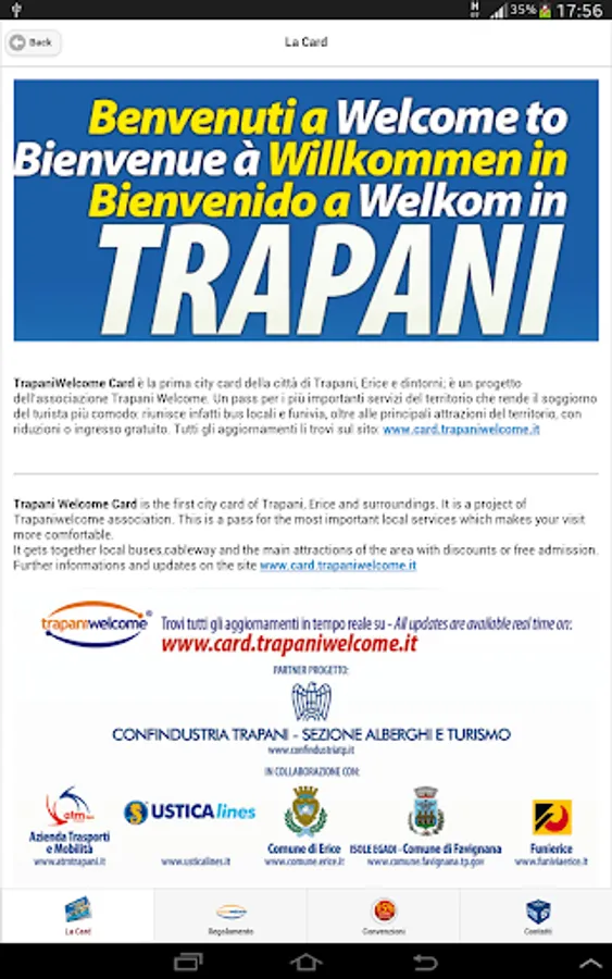 It gets together local buses,cableway and the main attractions of the area with discounts or free admission. Further informations and updates on the site www.card.trapaniwelcome.it