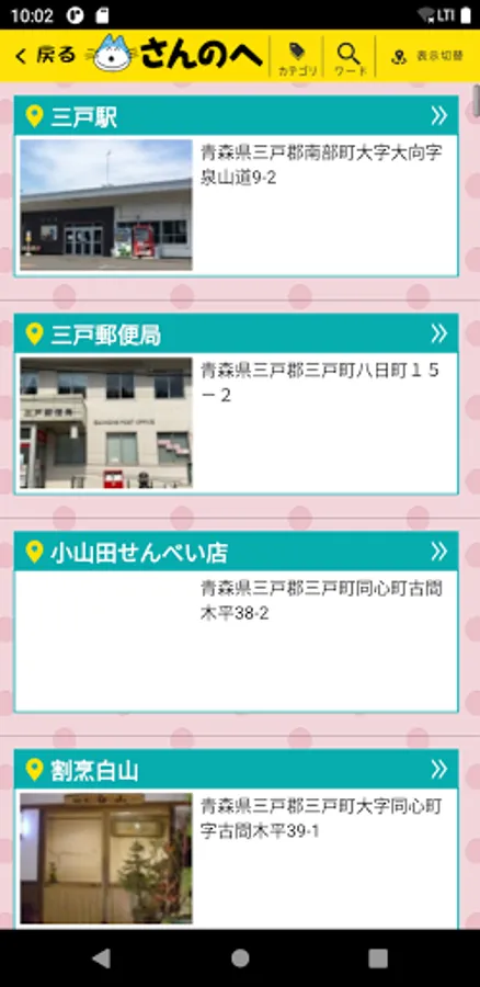 ○ Full of sightseeing spots, gourmet food, shopping information, etc. in Sannohe Town! Search from around your current location, search by category, navigation using GPS is possible