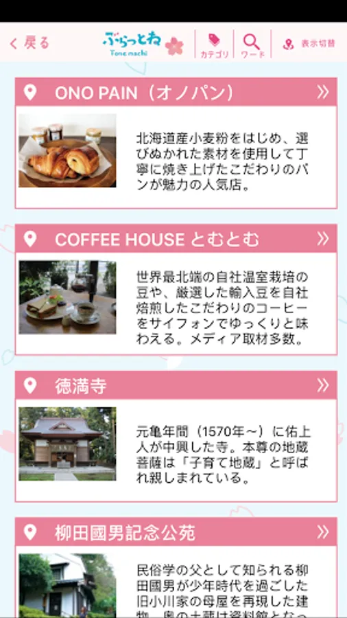 ○ Full of sightseeing spots, gourmet food, shopping information, etc. in Tone Town! Search from around your current location, search by category, navigation using GPS is possible