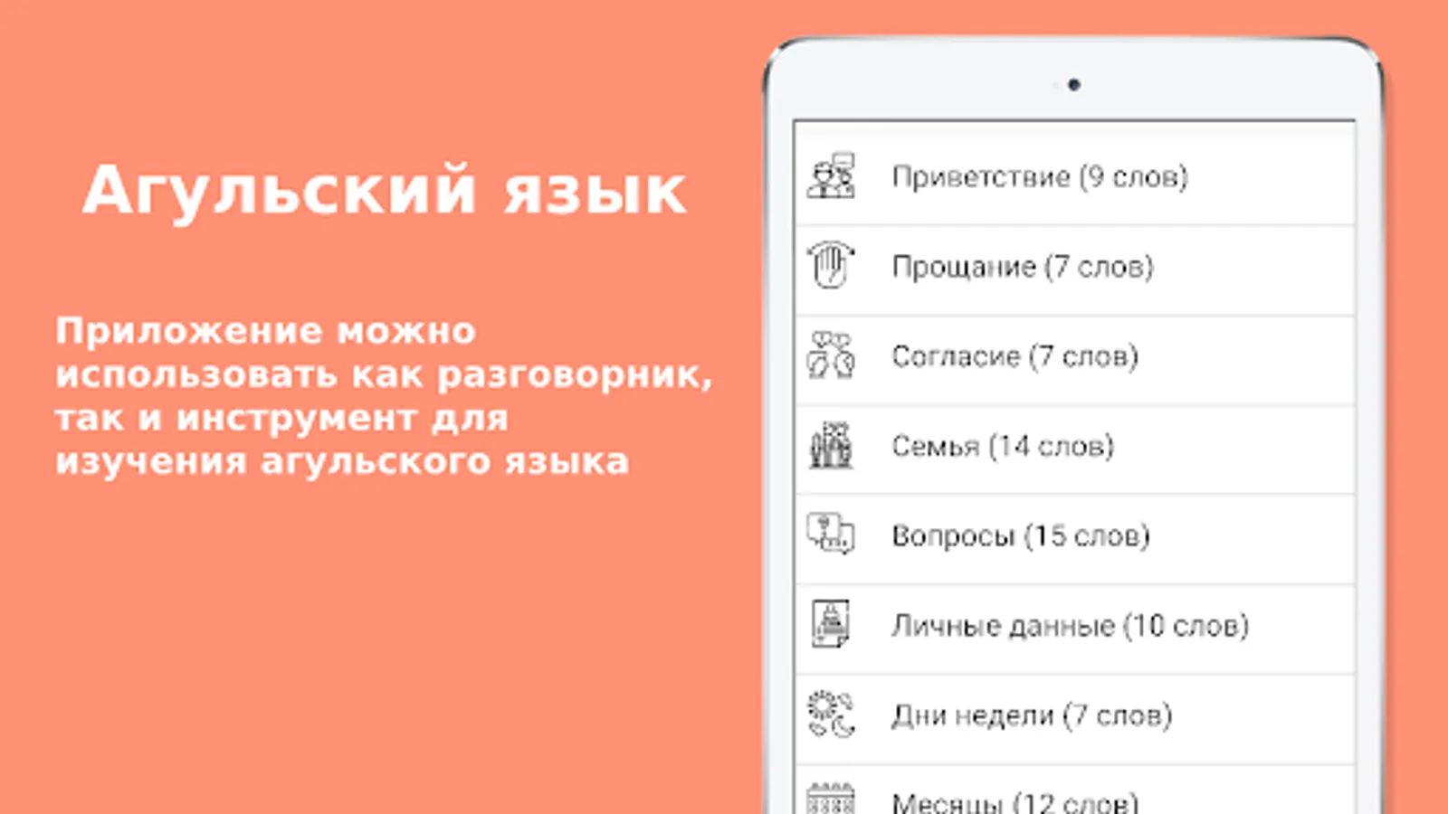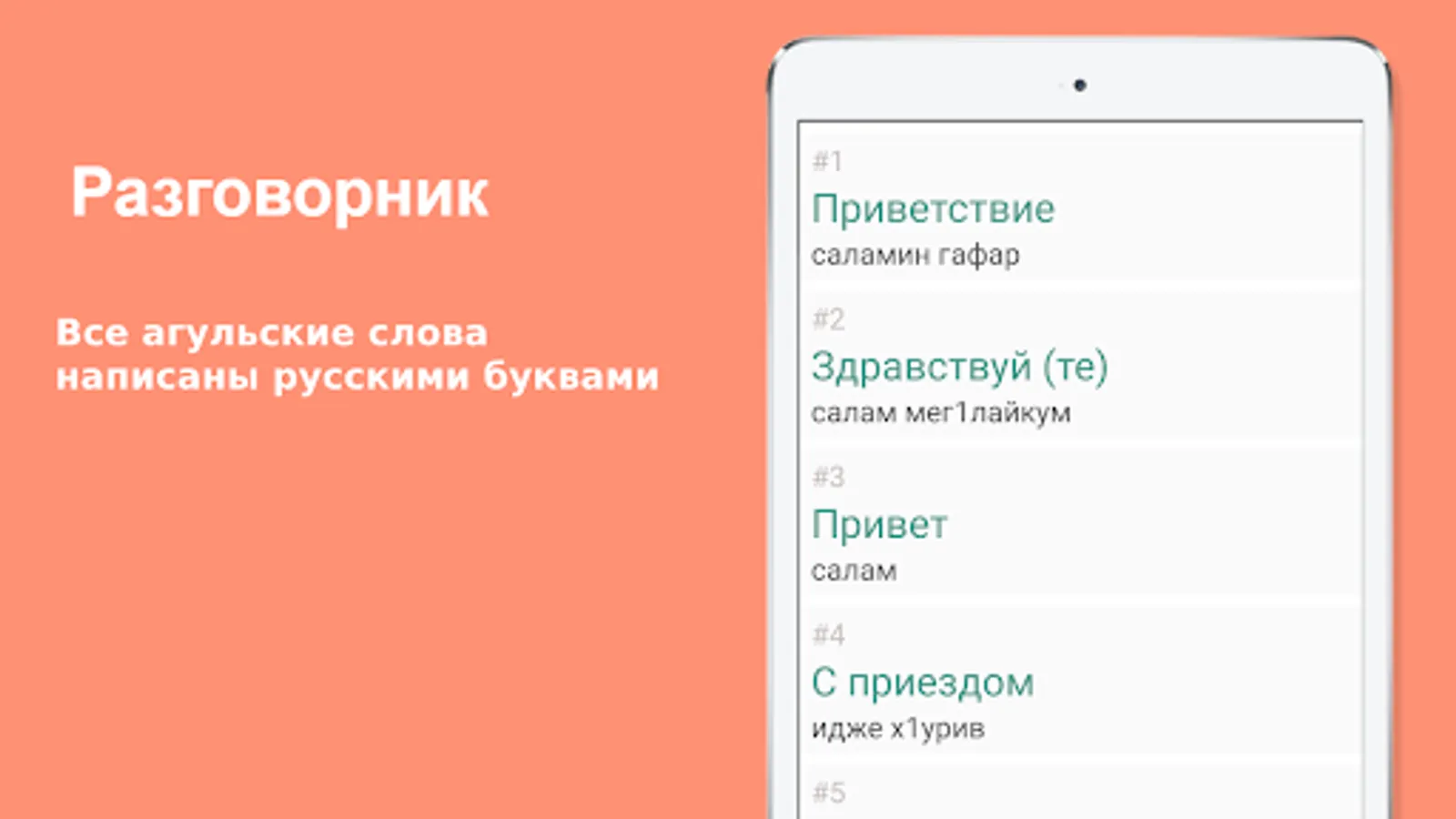 The Russian-Agul phrasebook can be used, respectively, as a phrasebook and as a tool for learning the Agul language. All Agul words are written in Russian letters and are divided into 10 logical topics, that is, the phrasebook is designed for a Russian-speaking user (tourist).