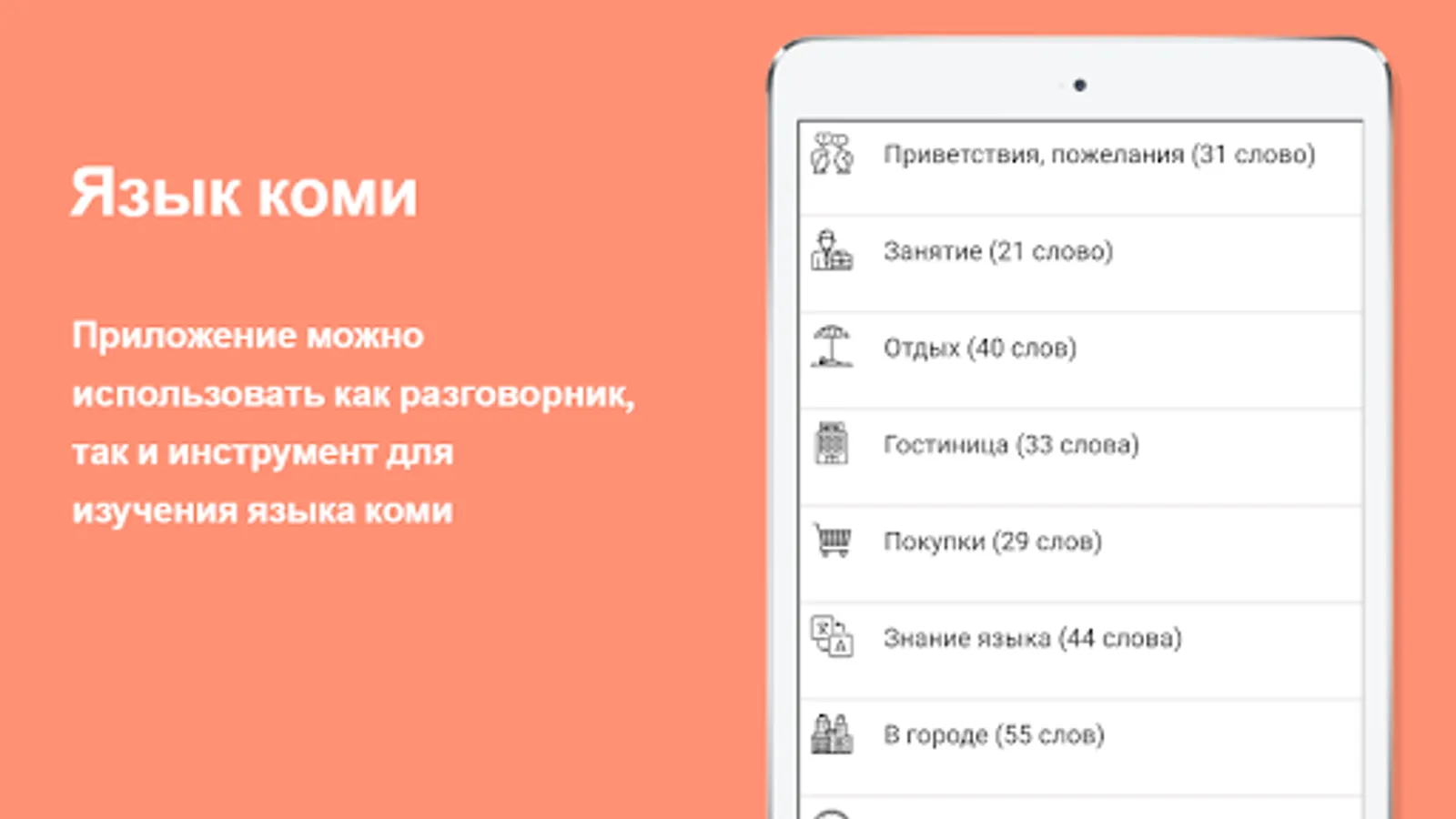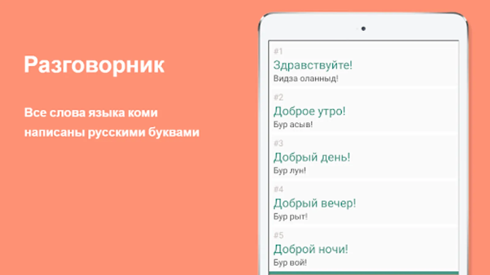 Komi language - a phrasebook can be used respectively as a phrasebook and as a tool for learning the Komi language. All the words of the Komi language are written in Russian letters and are divided into 14 logical topics, that is, the phrasebook is designed for a Russian-speaking user (tourist).