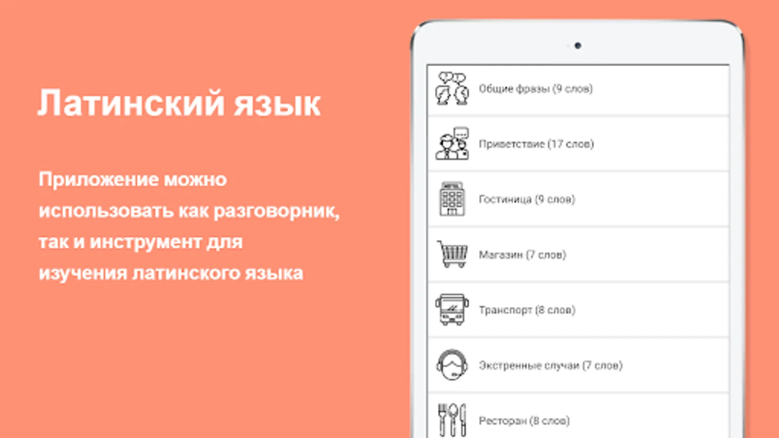 The Russian-Latin phrasebook can be used, respectively, as a phrasebook and as a tool for learning Latin. All Latin words are written in Russian letters and are divided into 10 logical topics, that is, the phrasebook is designed for a Russian-speaking user (tourist).