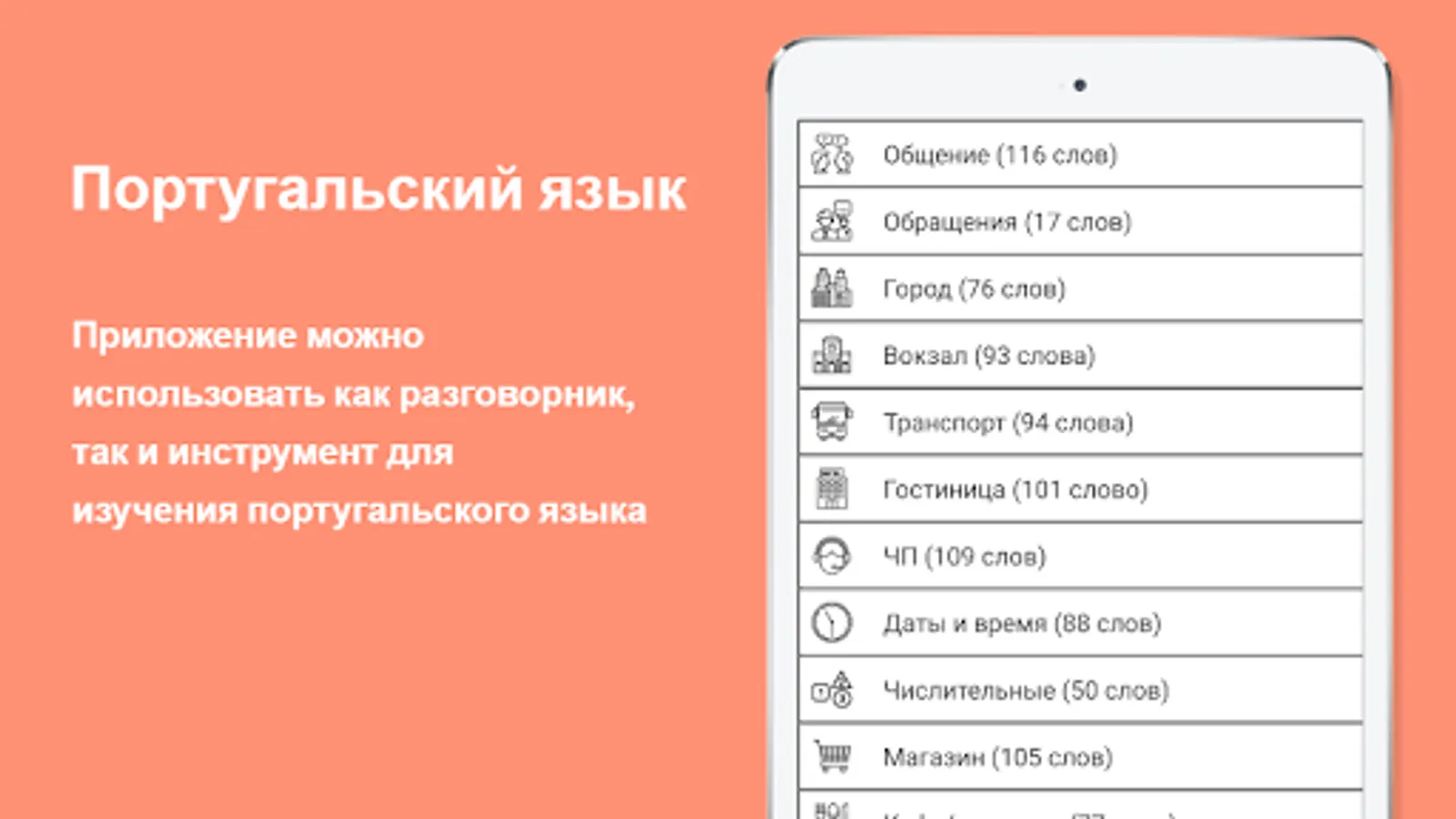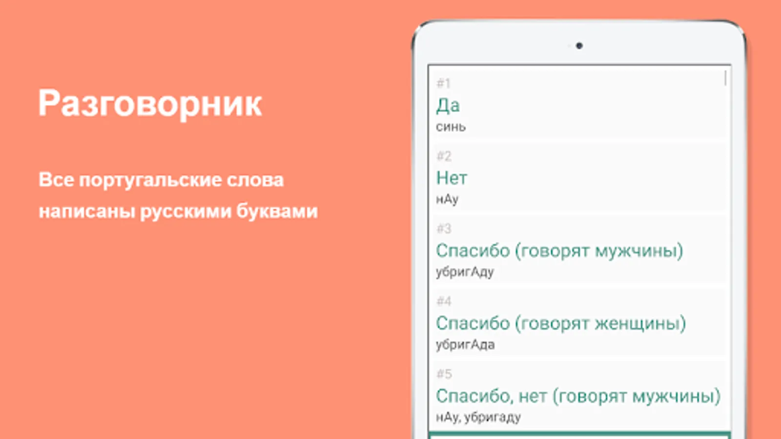 The Russian-Portuguese phrasebook can be used respectively, both a phrasebook and a tool for learning Portuguese. All Portuguese words are written in Russian letters and are divided into 11 logical topics, that is, the phrasebook is designed for a Russian-speaking user (tourist).
