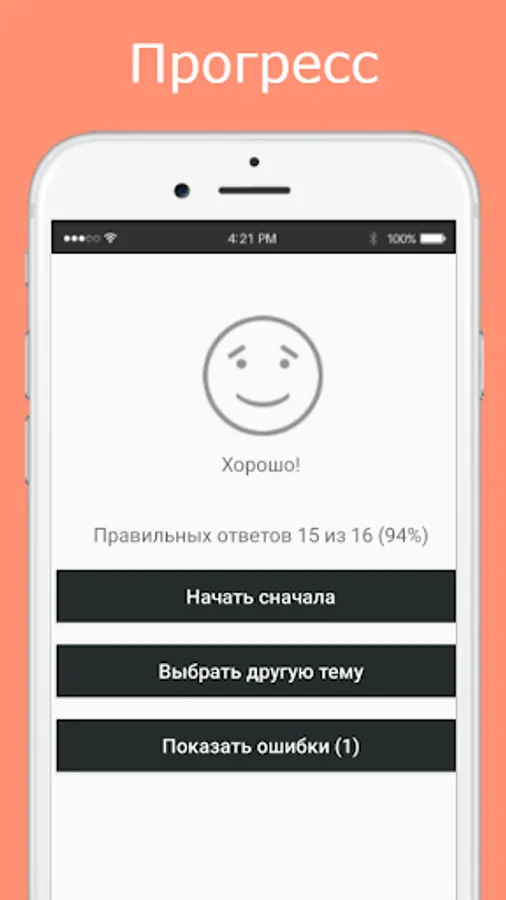 After passing the test on the selected topic, you can view the errors. Also, the test result for each topic is saved, your goal is to learn all the words in the selected topic 100%.