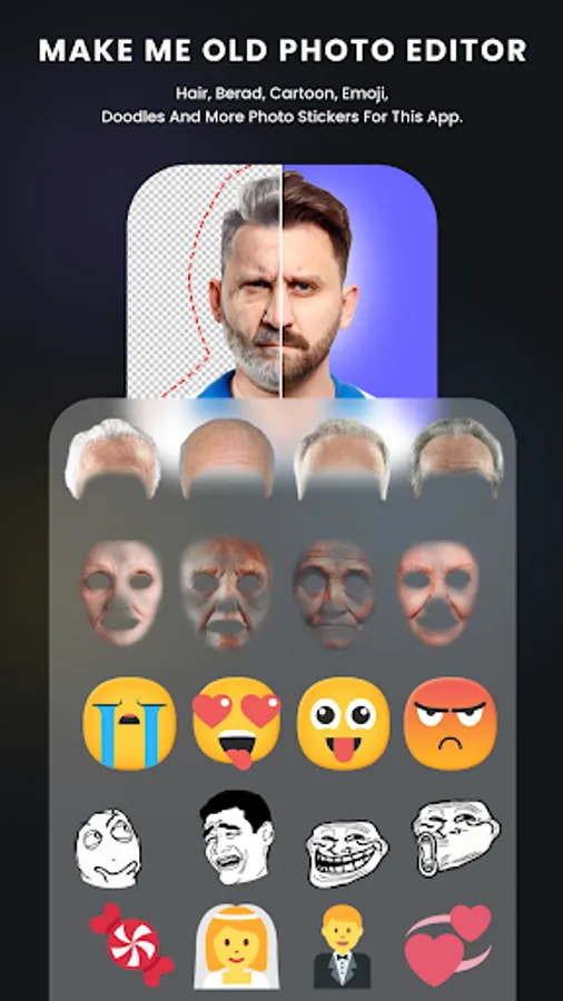 Oldify Me Photo Editor is packed with powerful photo editing tools and features that allow you to age your face with precision. Our app has 100s of aging advanced stickers to put on your face, ensuring that your transformed photos look as authentic as possible.