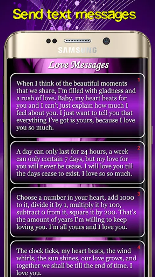 ♥ Love sms Collection is the best sms collection consisting of more than 1000 love messages. Now you can not break your head, coming up with an original SMS. This application will help you to declare your love to a person you love, write a compliment, tell about your sincere feelings to your loved ones. Allows you to send SMS messages directly from the app. You can also declare your love or congratulate a loved one with the help of postcards.