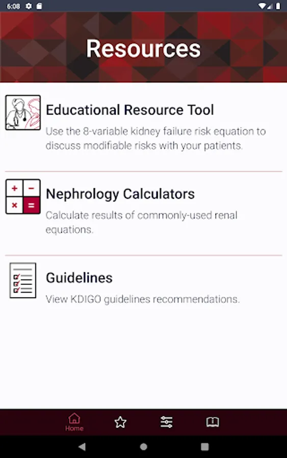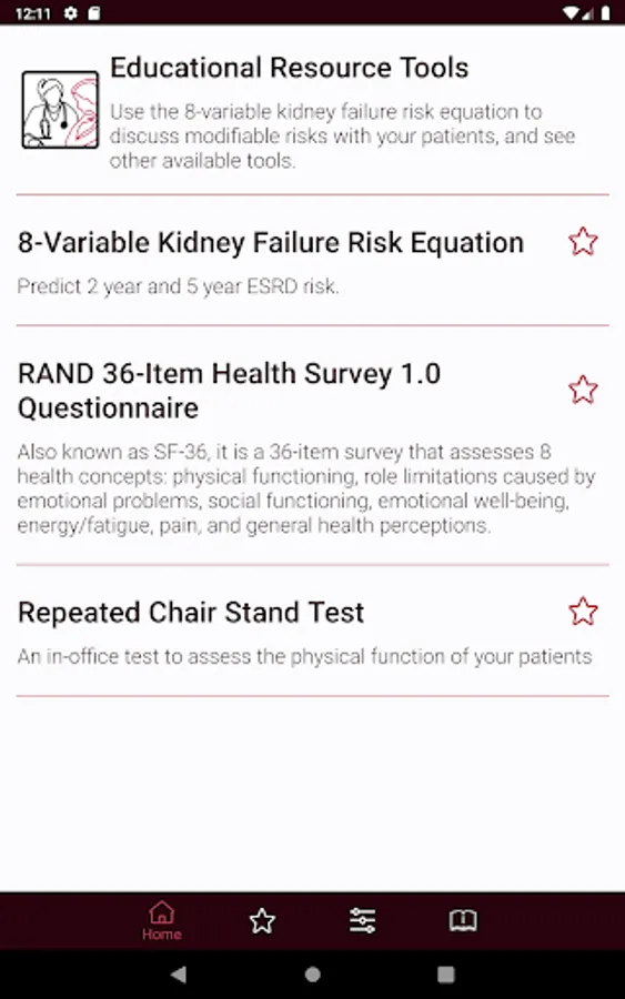 Neph+ features educational resource tools, management guidelines and nephrology equation calculators. Recent updates to the app include resource tools to help assess physical functioning in your patients, including the RAND-36 Quality of Life Survey and Repeated Chair Stand Test, and excerpts from the KDOQI Clinical Practice Guidelines for Hemodialysis Adequacy (2015 Update).