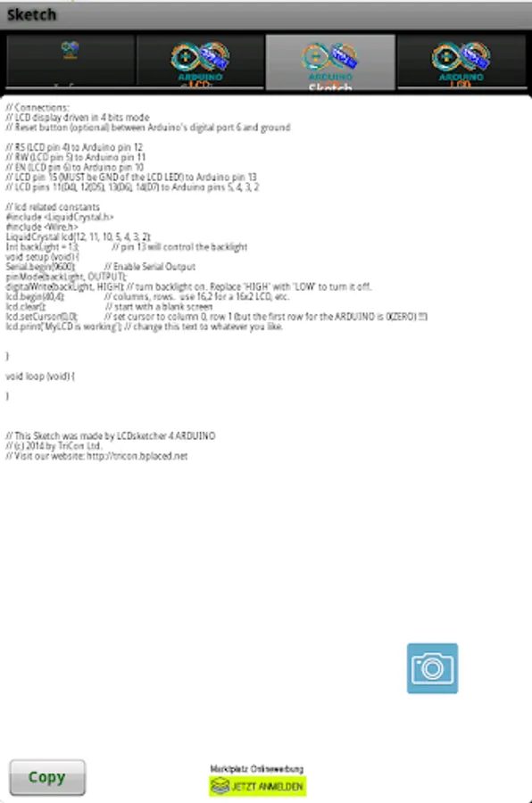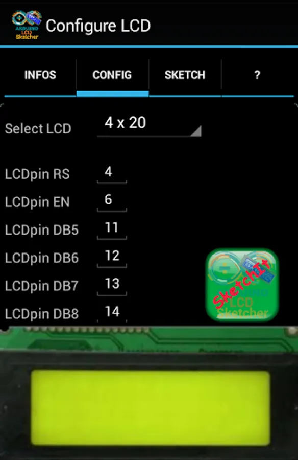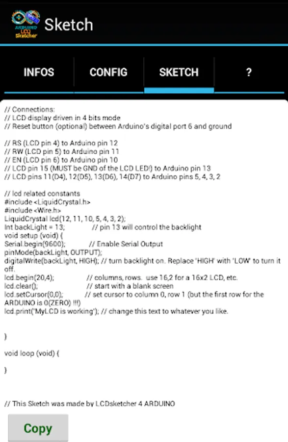With the built-Sketch generator you can - after entering their own pins from its own LCD - create a complete executable Sketch for the 4-bit mode: with 6 cables and PLUS and MINUS to save on a UN some pins.