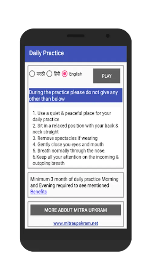 METHOD Developing Right Awareness, through awareness of natural respiration. is the essence of MITRA, The students learn to observe the natural normal incoming breath and outgoing breath by focusing their attention at the entrance of their nostrils. They, without any imaginations or evaluation, simply observe their natural breath without trying to change, regulate or control the flow. This is the initial steps of Self-Awarenes