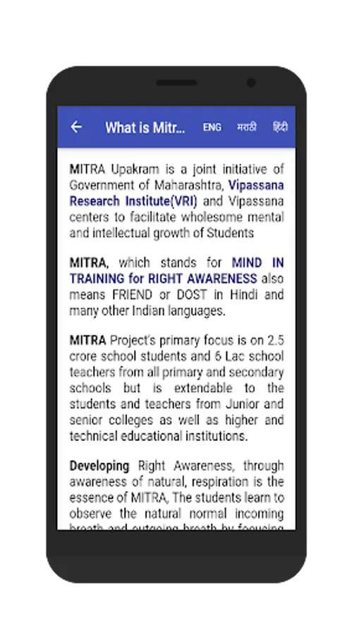 MITRA Upakram is a joint initiative of Government of Maharashtra, Vipassana Research Institute(VRI) and Vipassana centers to facilitate wholesome mental and intellectual growth of Students