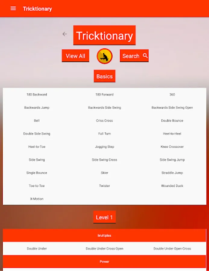 The Tricktionary is organized by type (Basics, Multiples, Power, Rope Manipulation, and Releases) and by level (1-4). It provides a description, a video, prerequisites, and what to learn next for each trick.