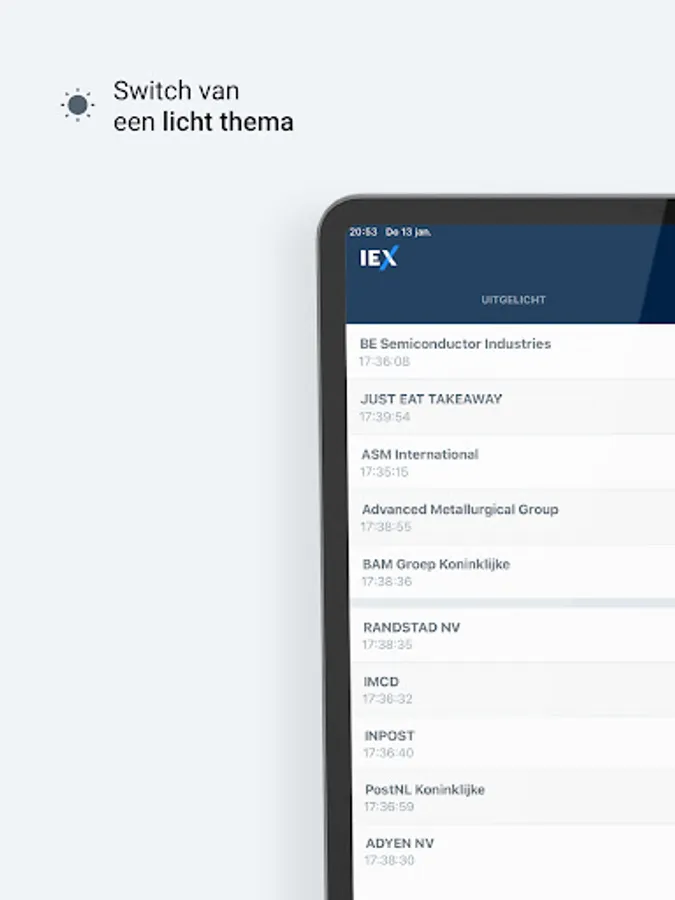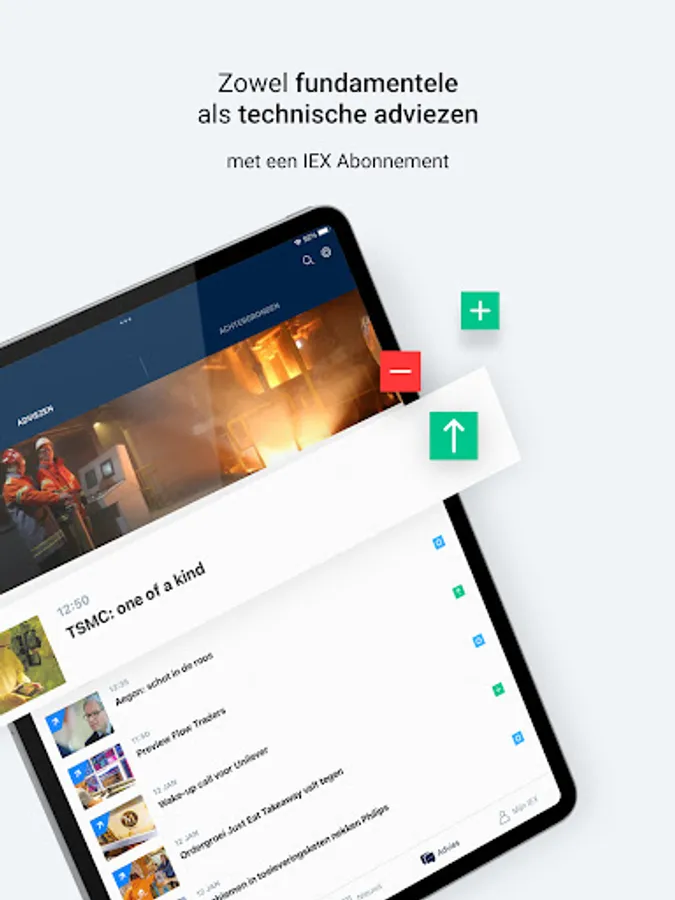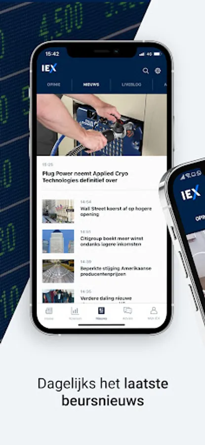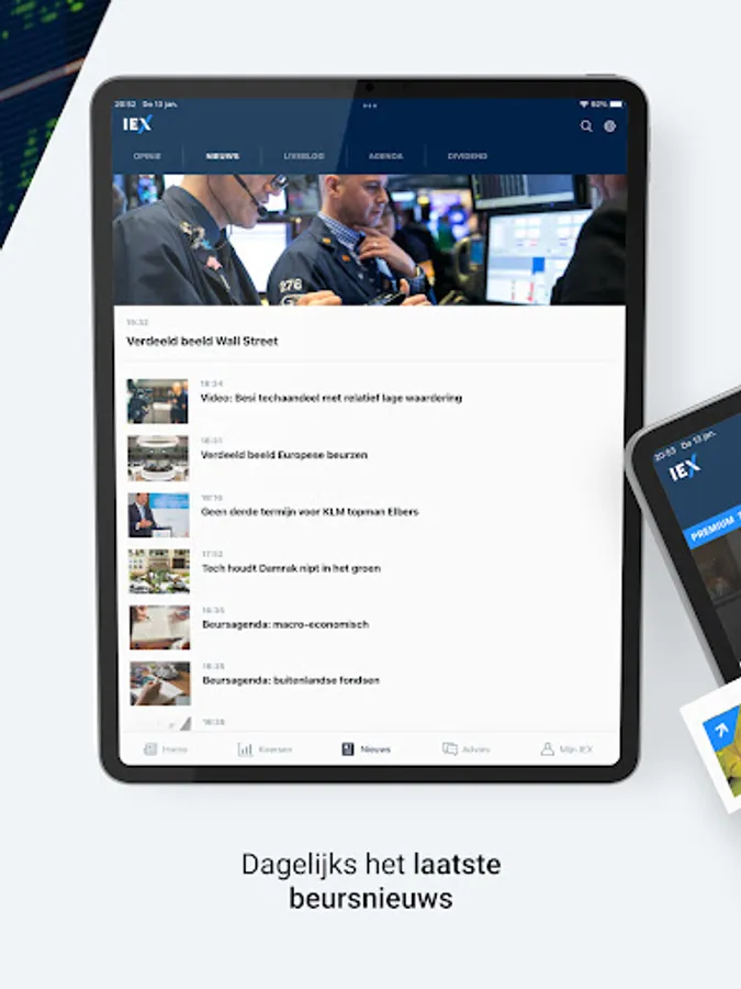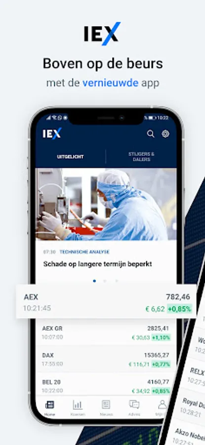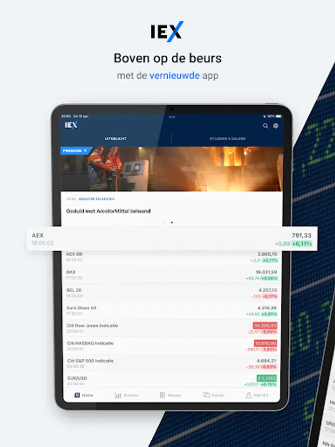 The IEX app offers the most extensive range of free price information in the Netherlands. You can follow the current positions of Dutch indices such as the AEX, AMX and AScX in real time, as well as the major European, American and Asian indices and stock exchanges. Of course, cryptos, commodities, interest rates, currencies, trackers and investment funds are also included.