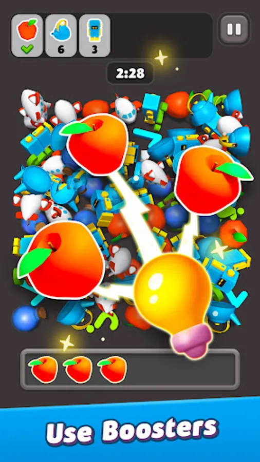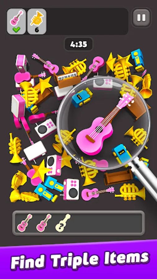 🎰 Match 3 identical items. Just tap to place them into the stack. You are looking for a triple goods match 3D, for instance, three oranges 🍊+🍊+🍊.