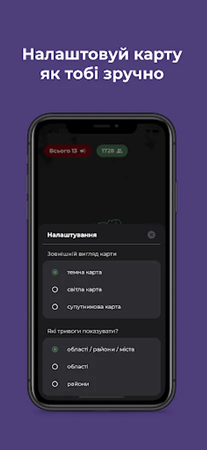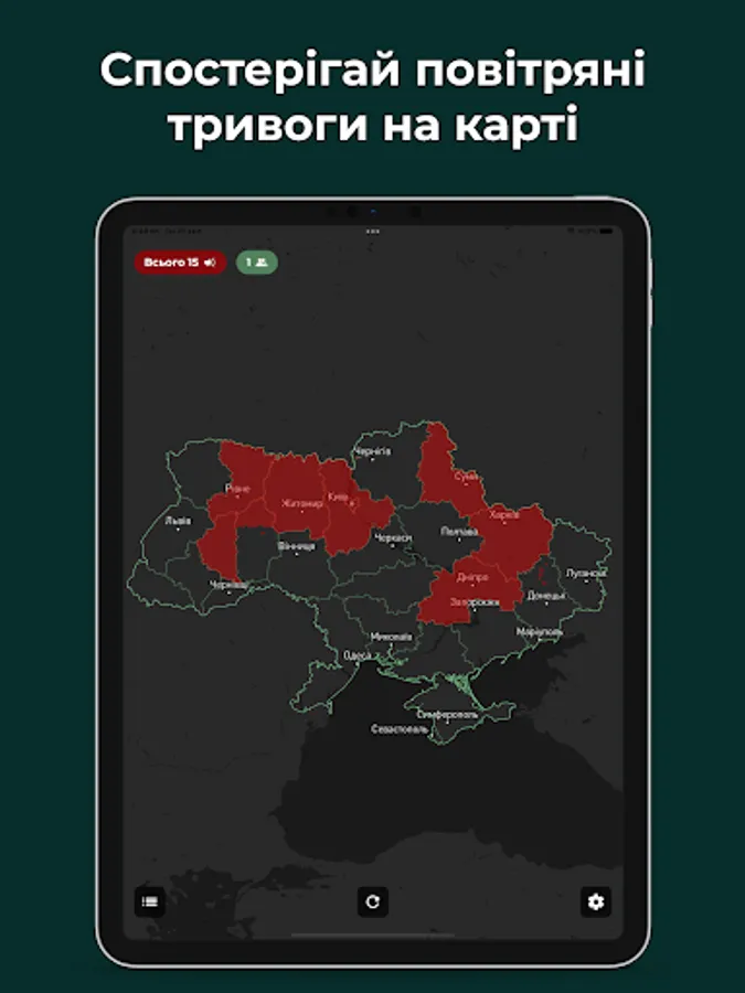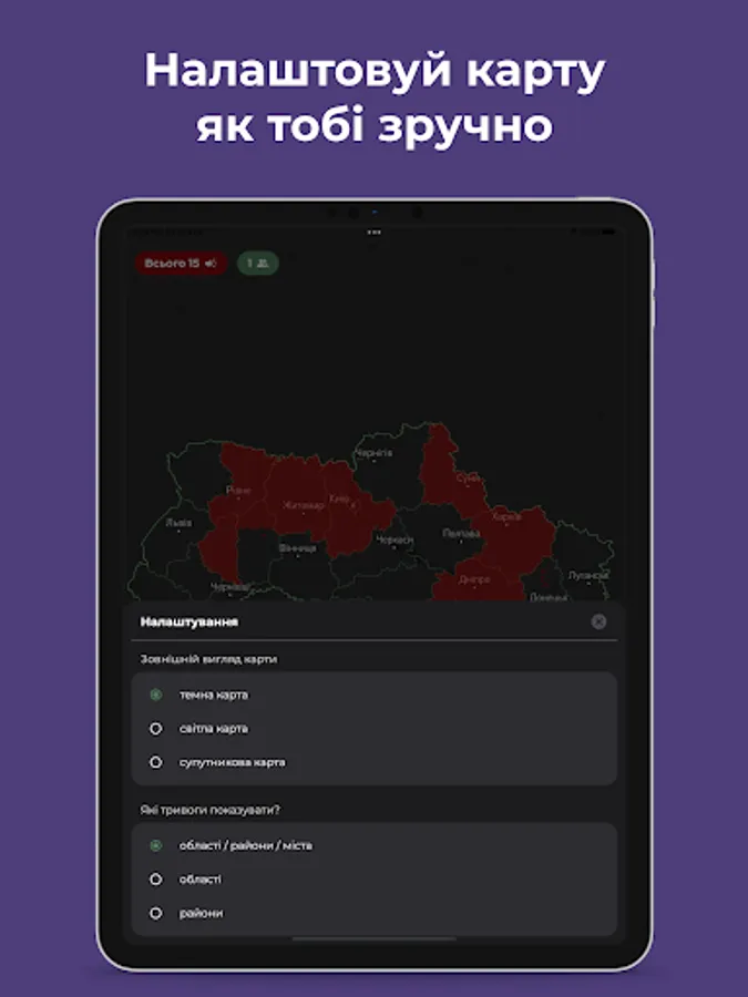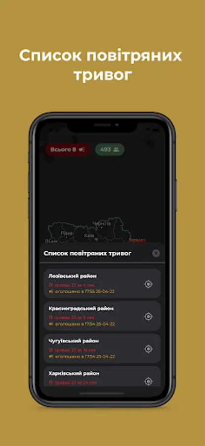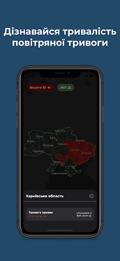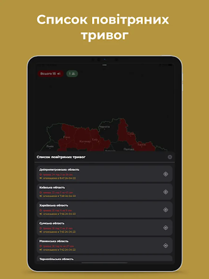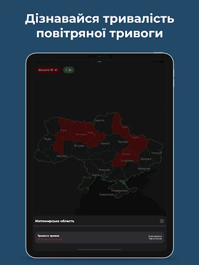 The alarm map helps you visually monitor which areas or areas are currently on alert. Also see how long the air alarm lasts.