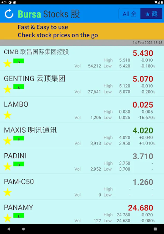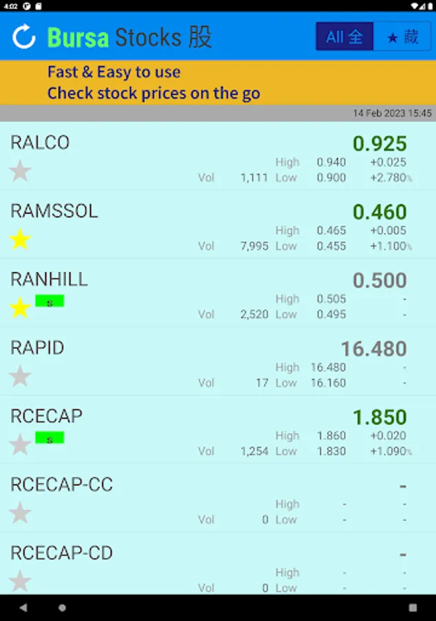- View stock prices of the companies listed on the Singapore Bursa Stock Exchange (Bursa / KLSE).