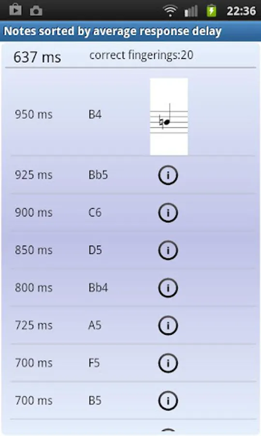 During the fingering training the app analyzes the fingerings and creates corresponding statitics. These statistics are used by the app to focus the learing on wrong or weak memorized fingerings. The gathered statistic data like the "hit ratio" or the "average response delay" for each note is provided in statistic views for further investigations. And of cause can be used to measure the progress in learning with this app.