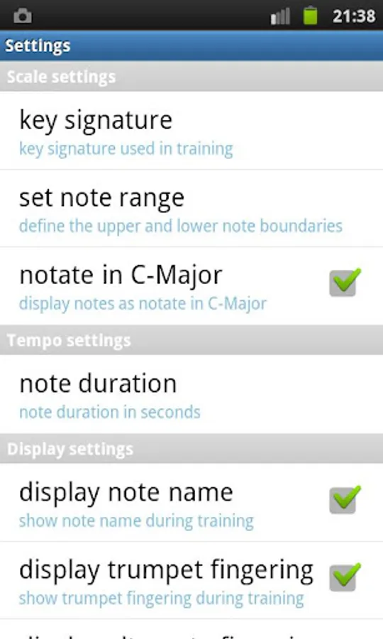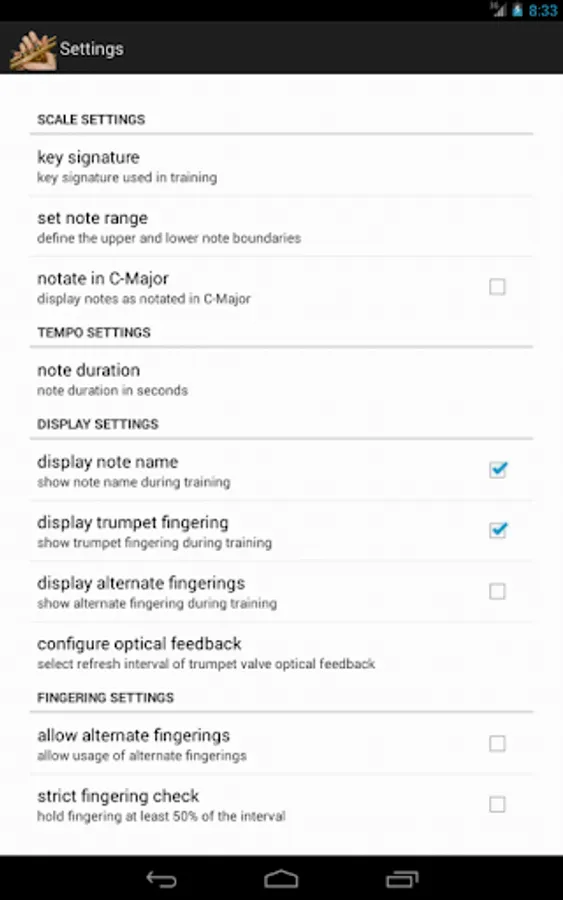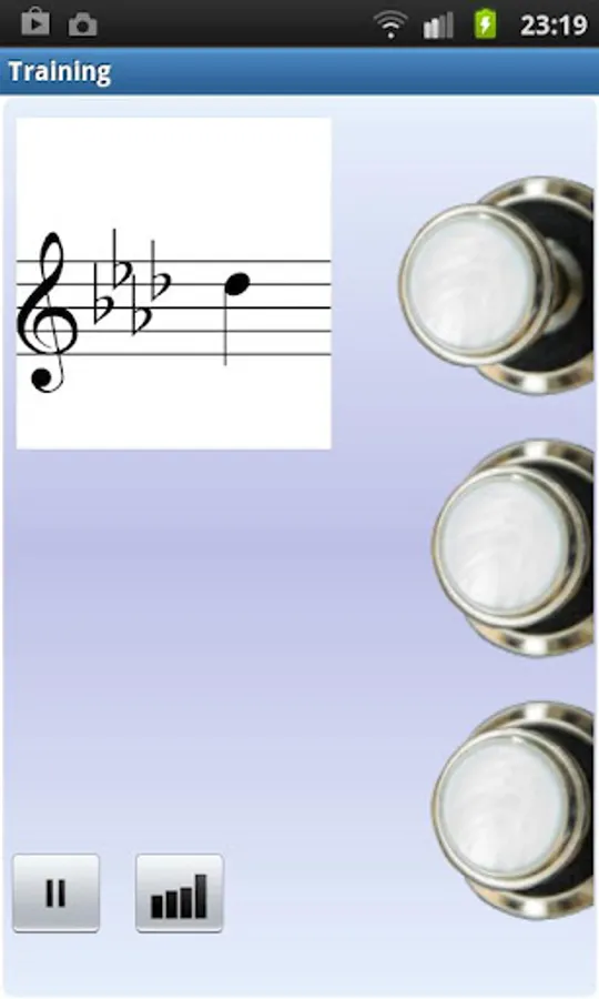 In the first phase, the application randomly displays notes in the range defined by the user. Those notes have to be pressed and hold correctly on the touch-screen for the configured time interval. In case of an error, the application advises the user with the correct fingering that has to be confirmed, to continue the training.