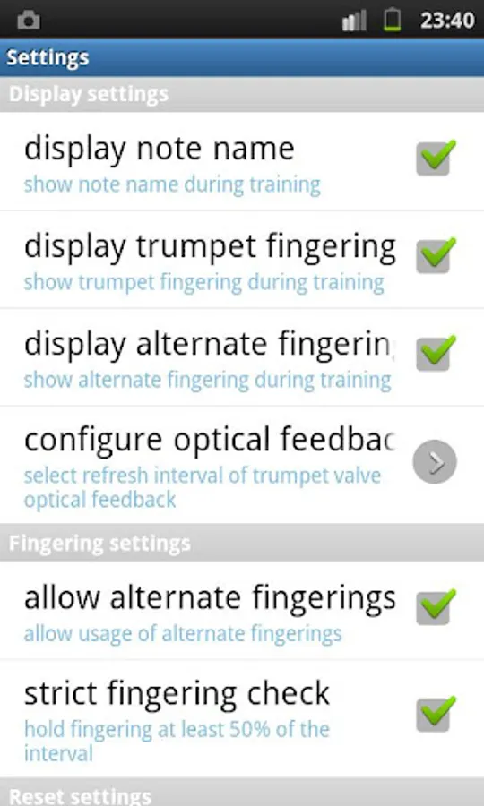 The demo version of the “Trumpet Fingering Trainer” application has the following restrictions: