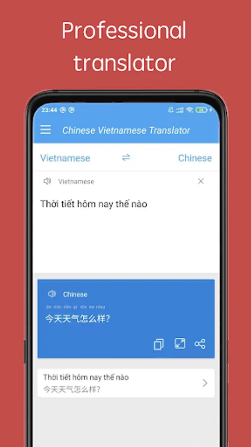 Chinese Vietnamese translator, it can be a good helper for you to learn Chinese and Vietnamese. When you are traveling or studying, use it as your mobile translation tool, download it now.