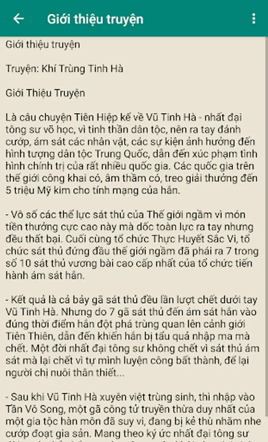 Là câu chuyện Tiên Hiệp kể về Vũ Tinh Hà - nhất đại tông sư võ học, vì tinh thần dân tộc, nên ra tay đánh cướp, ám sát các nhân vật, các sự kiện ảnh hưởng đến hình tượng dân tộc TQ, dẫn đến xúc phạm tình hình chính trị của rất nhiều quốc gia. Các quốc gia trên thế giới công khai có, âm thầm có, treo giải thưởng đến 5 triệu Mỹ kim cho tính mạng của hắn.