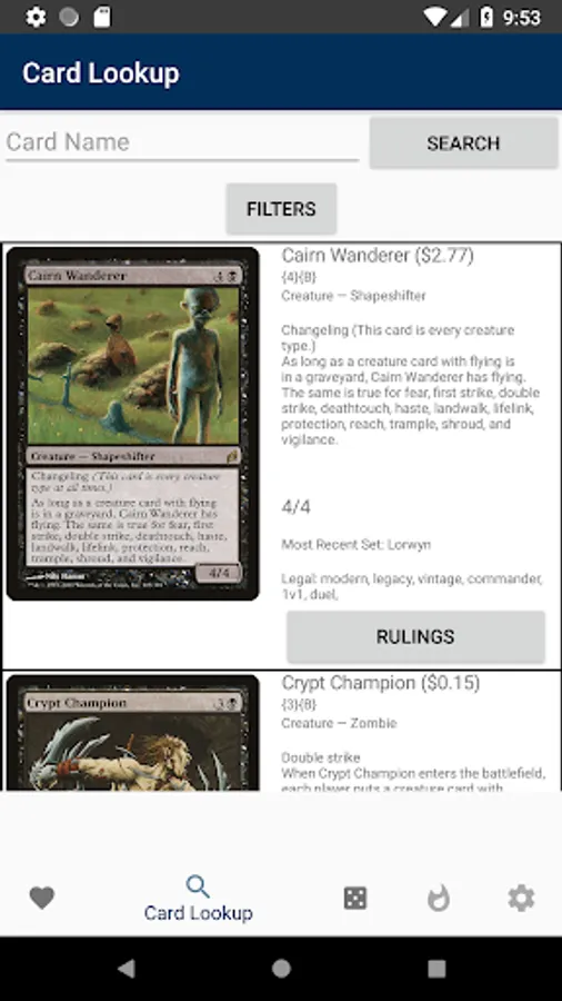 This app features a life counter for MTG games complete with fully customizable backgrounds to upload your own pictures or colors. Also featured is a full card lookup function complete with common ruling questions related to each card, as well as a dice roll feature to determine who goes first! Last but not least, it has data on the metagame for all of the most popular formats, look up what decks have been performing in top tournaments and online leagues! A great MTG life counter and MTG card lookup app!