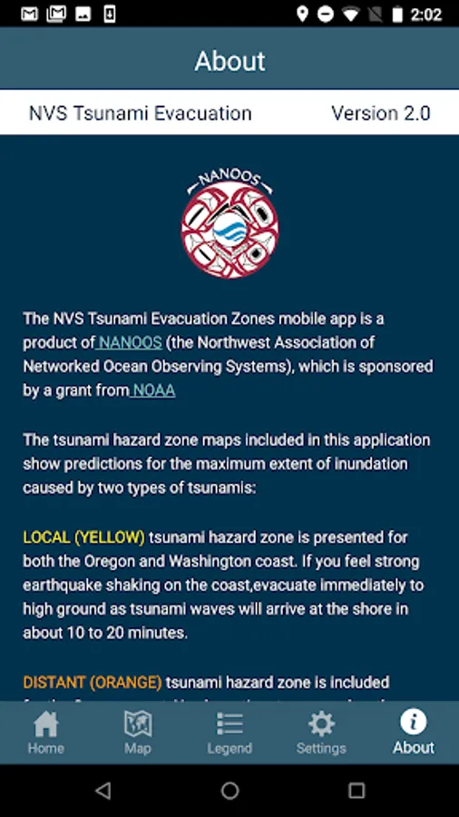 The NVS Tsunami Evacuation mobile app is a product of NANOOS, the Northwest Association of Networked Ocean Observing Systems. The goals of NANOOS are to present existing and develop new and experimental prediction data and products to address the ocean observing and predicting needs of local stakeholders such as tribes, state/local governments, researchers, industry, educators, and the general public.