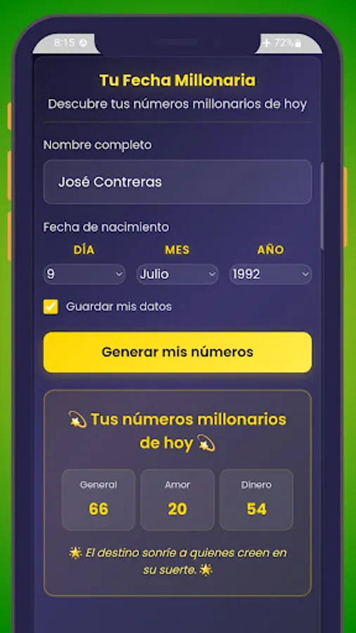 The app analyzes energetic vibrations using advanced numerology, combining your personal information with the energy of the day to offer you unique lucky numbers.