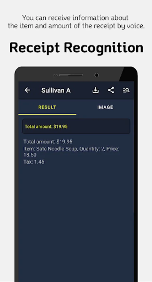 When you take a picture of a receipt, the item and amount of the receipt are announced by voice.