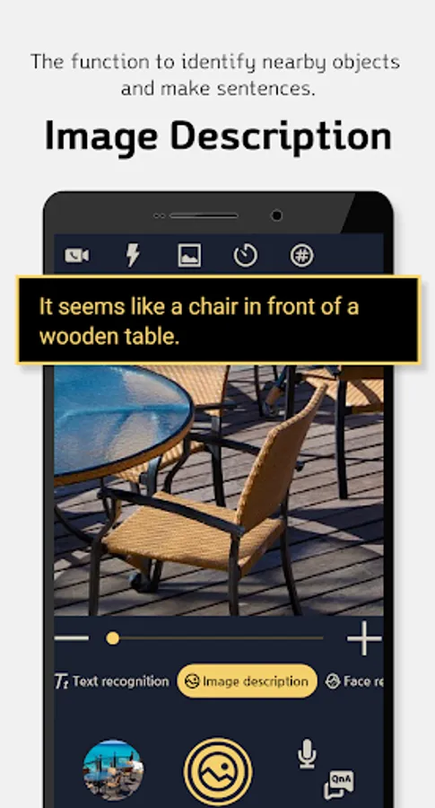 Image Description - Identifies objects around you and creates a sentence that describes the identified scene.