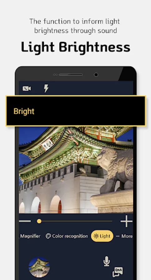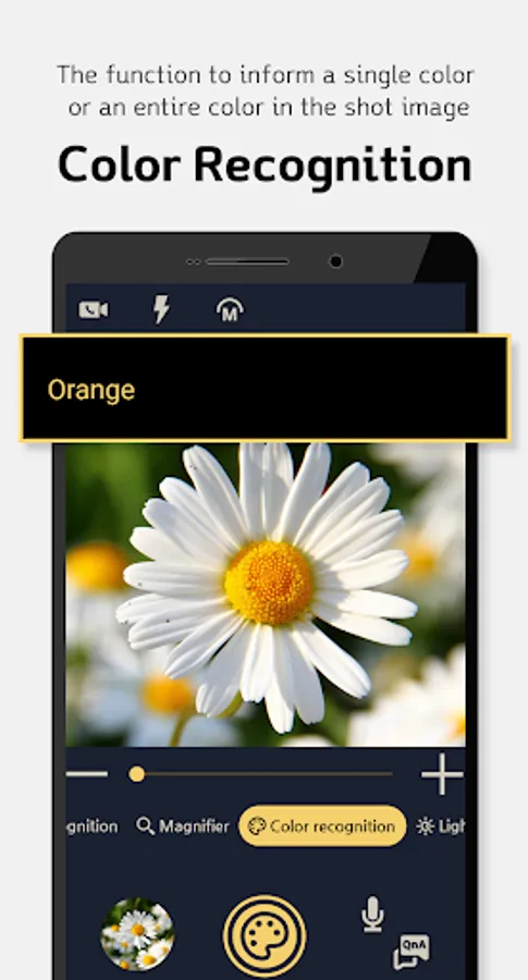 Color Recognition- Supports the single-color mode that tells you the color of the center of the screen and the full-color mode that tells you the color that occupies a large part of the entire screen.