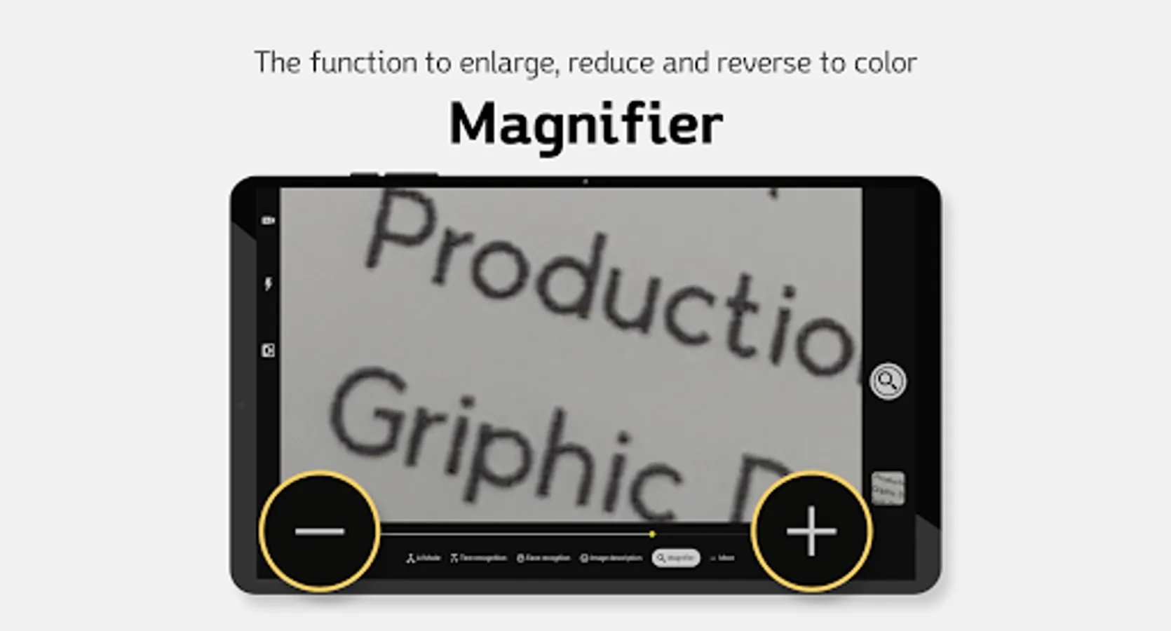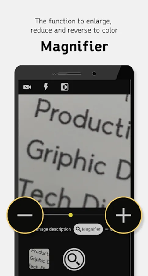 Magnifying glass function- Using the zoom function of the camera, it enlarges or reduces an object or text or inverts the color.
