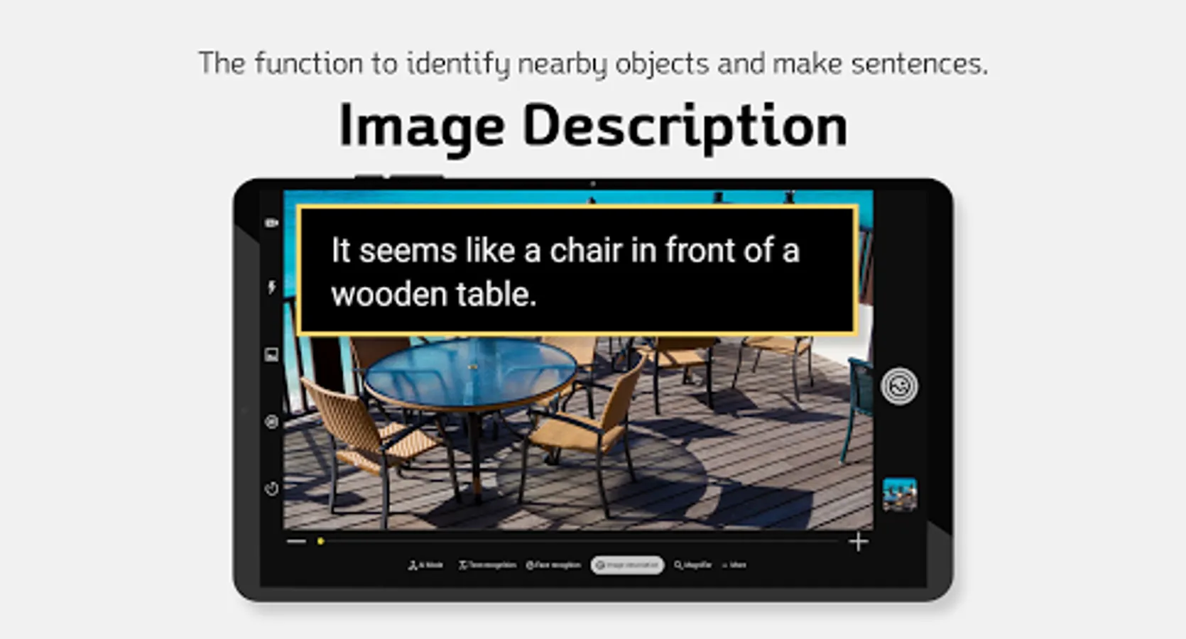 Image Description - Identifies objects around you and creates a sentence that describes the identified scene.