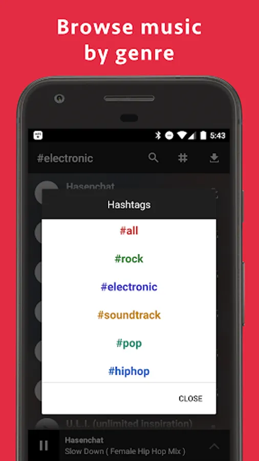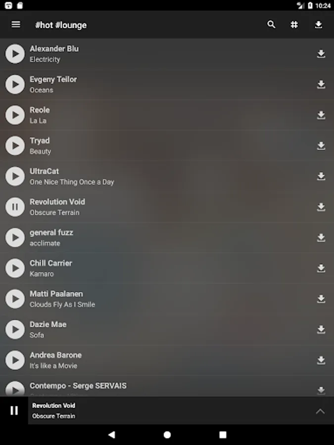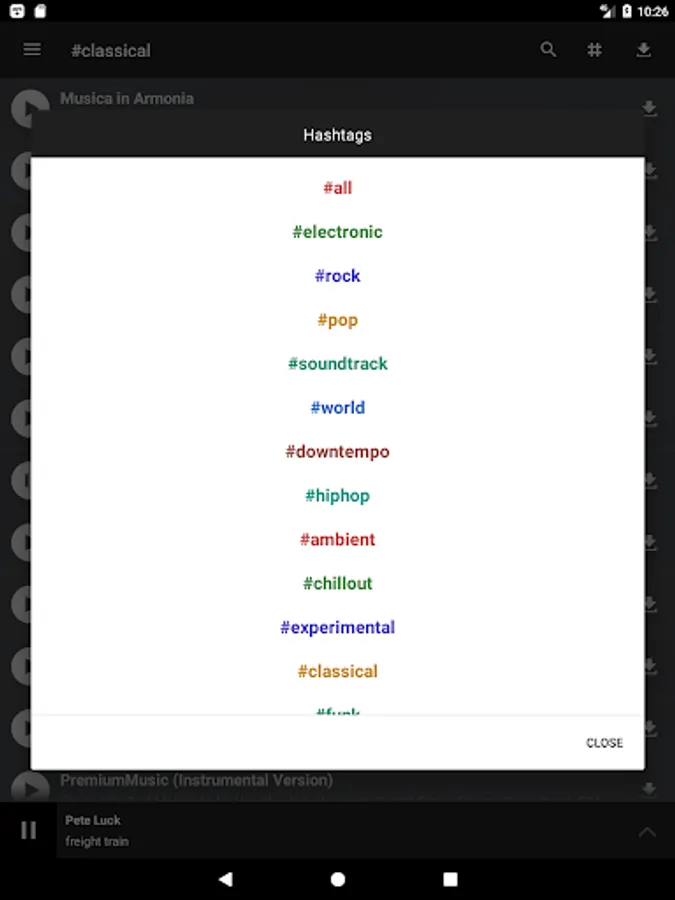 * If you don’t know any free mp3 music songs or artists who use Creative Commons license to publish their music mp3 songs for free, we recommend to navigate though music by genres. Tap the hashtag icon ("#") at the top, and select a music genre you like. Our mp3 music download app will find such mp3 music songs that you can enjoy and download to your Android phone and tablet. If you pull the screen down, the mp3 downloader will refresh the mp3 songs list, so you could enjoy other music of the same genre and download other mp3 songs.