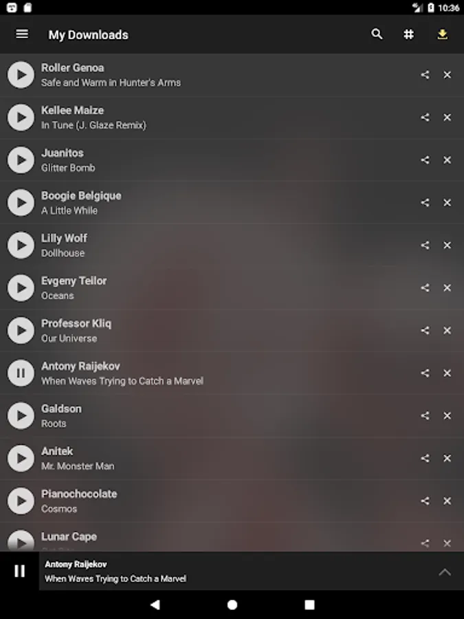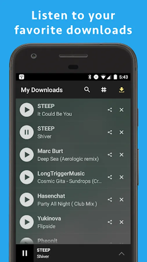 * Access all the downloaded mp3 music from a separate tab (tap the download button at the top right corner to get there). From there you can share the dowloaded mp3 songs with your friends (or yourself). Enjoy free mp3 music, and build your own free mp3 music library.