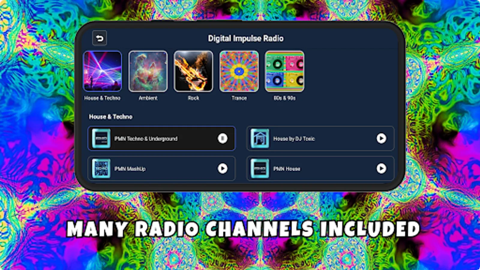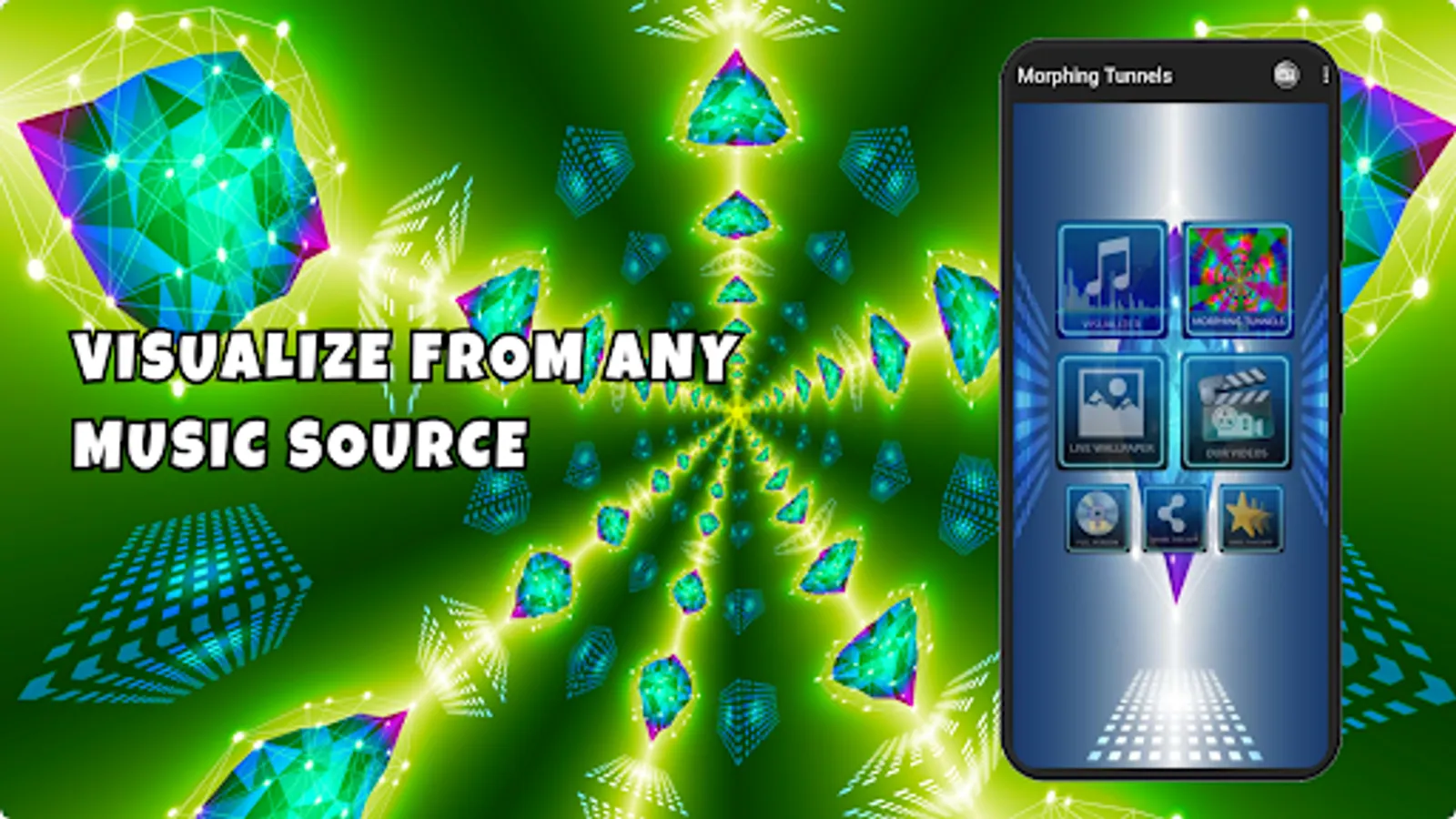 Play music with any audio app. Then switch to the music visualizer and it will visualize the sound. A player for your music files is also included. Many radio channels are also available with music styles like house, ambient, rock and trance.